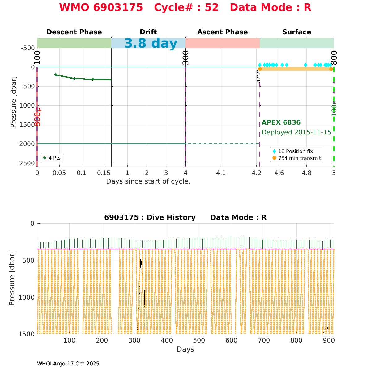 | WMO: #6903175 DAC: coriolis PI: Pierre-Marie POULAIN APEX: #6836 DRUCK_2900PSIA: #3819186 SBE41: #6307 Altimeter Comparison (IFREMER) EuroArgo Link | ![]() |