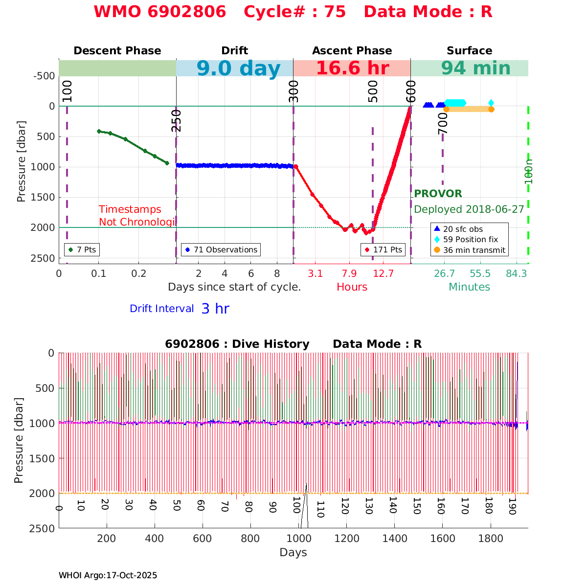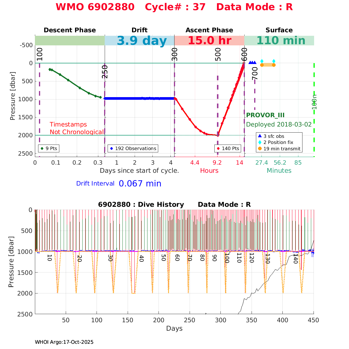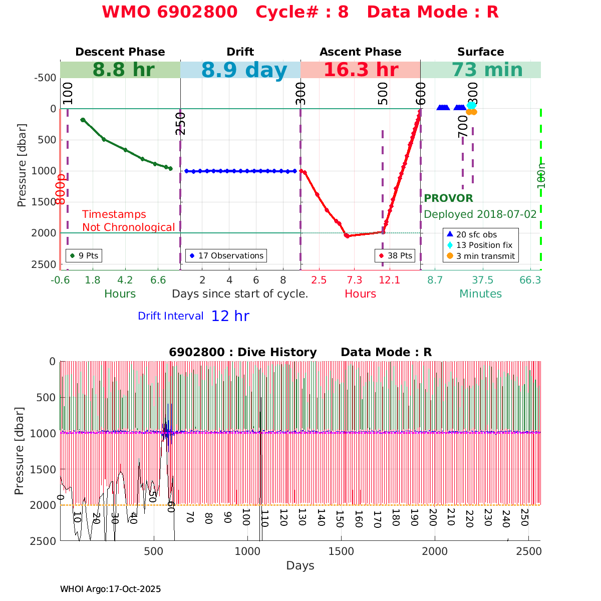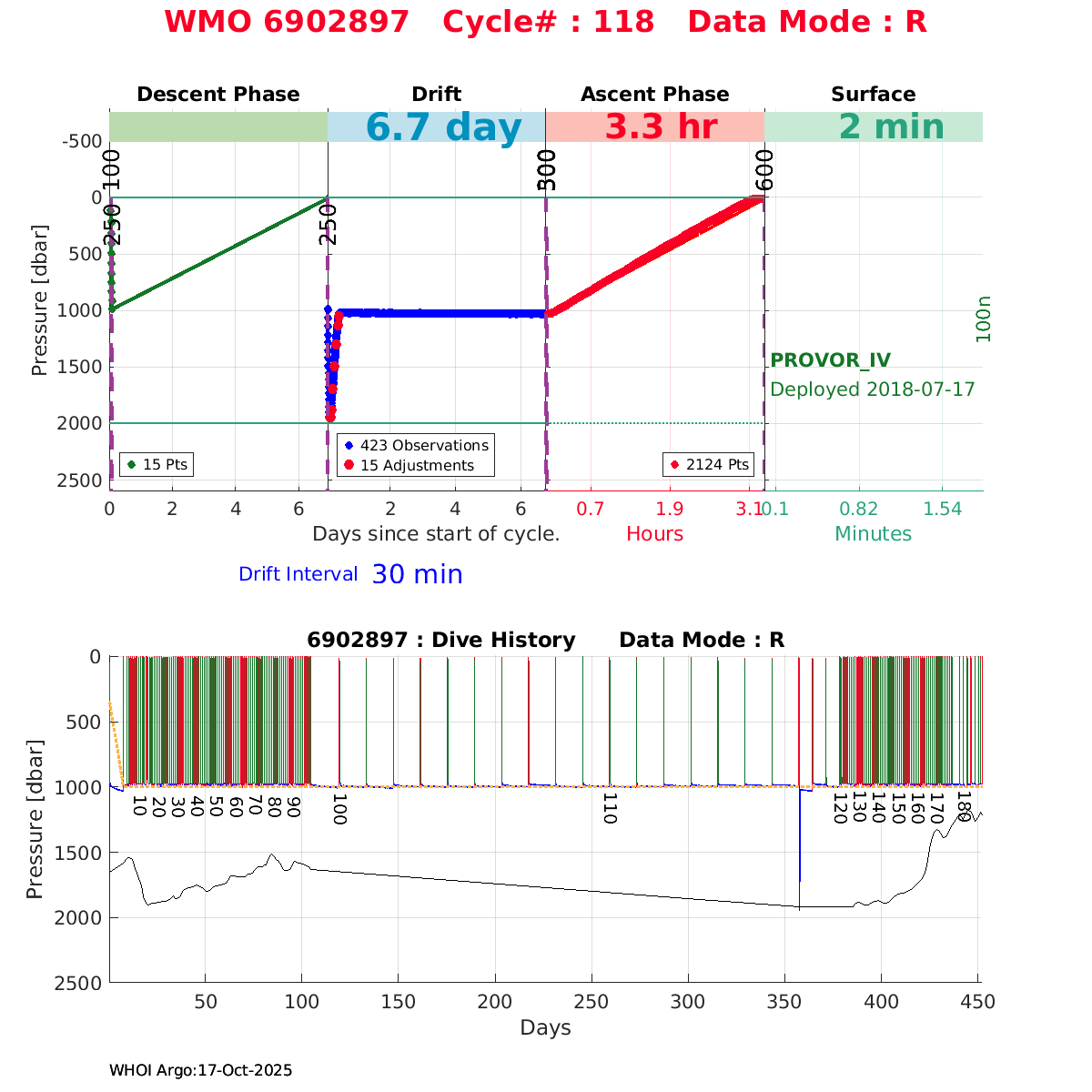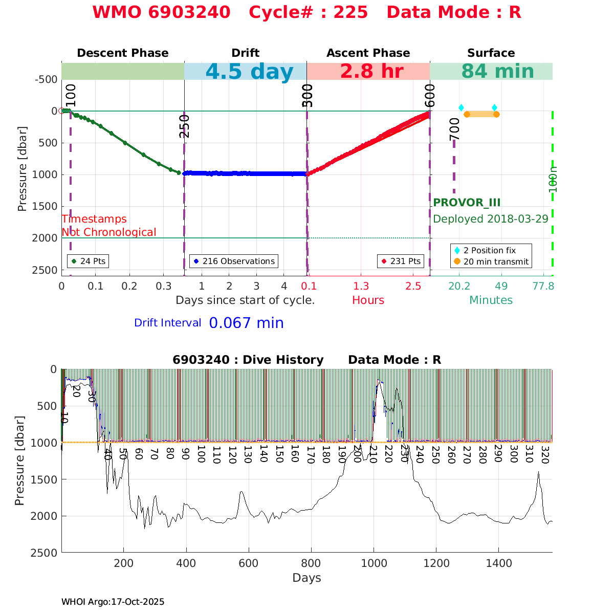 | WMO: #6902898 DAC: coriolis PI: Fabrizio D'ORTENZIO PROVOR_III: # KISTLER_2900PSIA: #2099901 SBE41CP: #4443 SATLANTIC_OCR504_ICSW: #40219 ECO_FLBBCD: #2439 Altimeter Comparison (IFREMER) EuroArgo Link | ![]() |