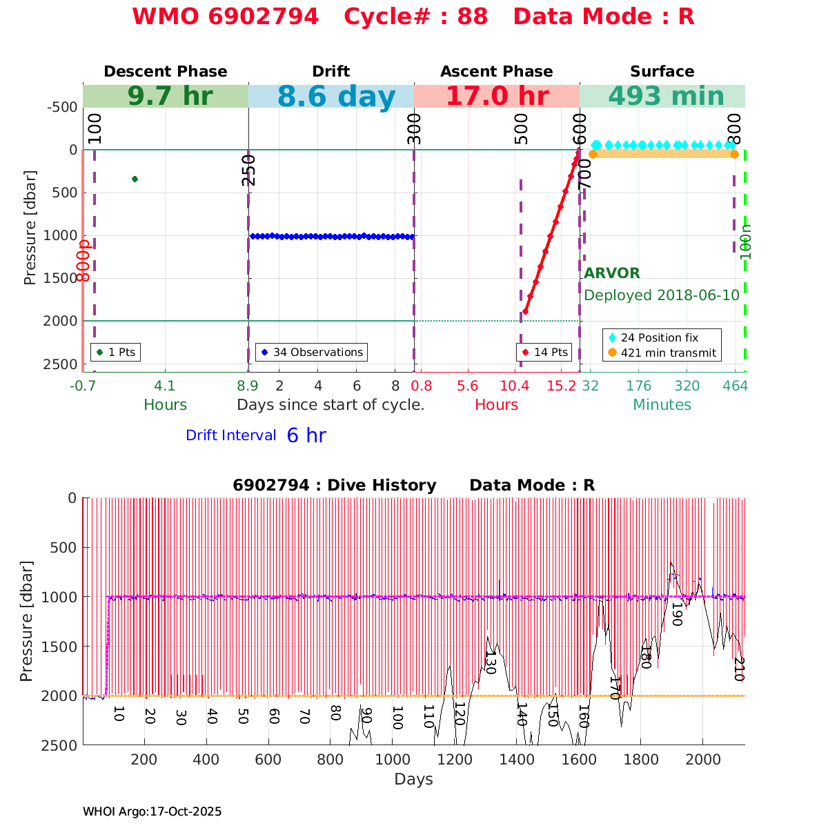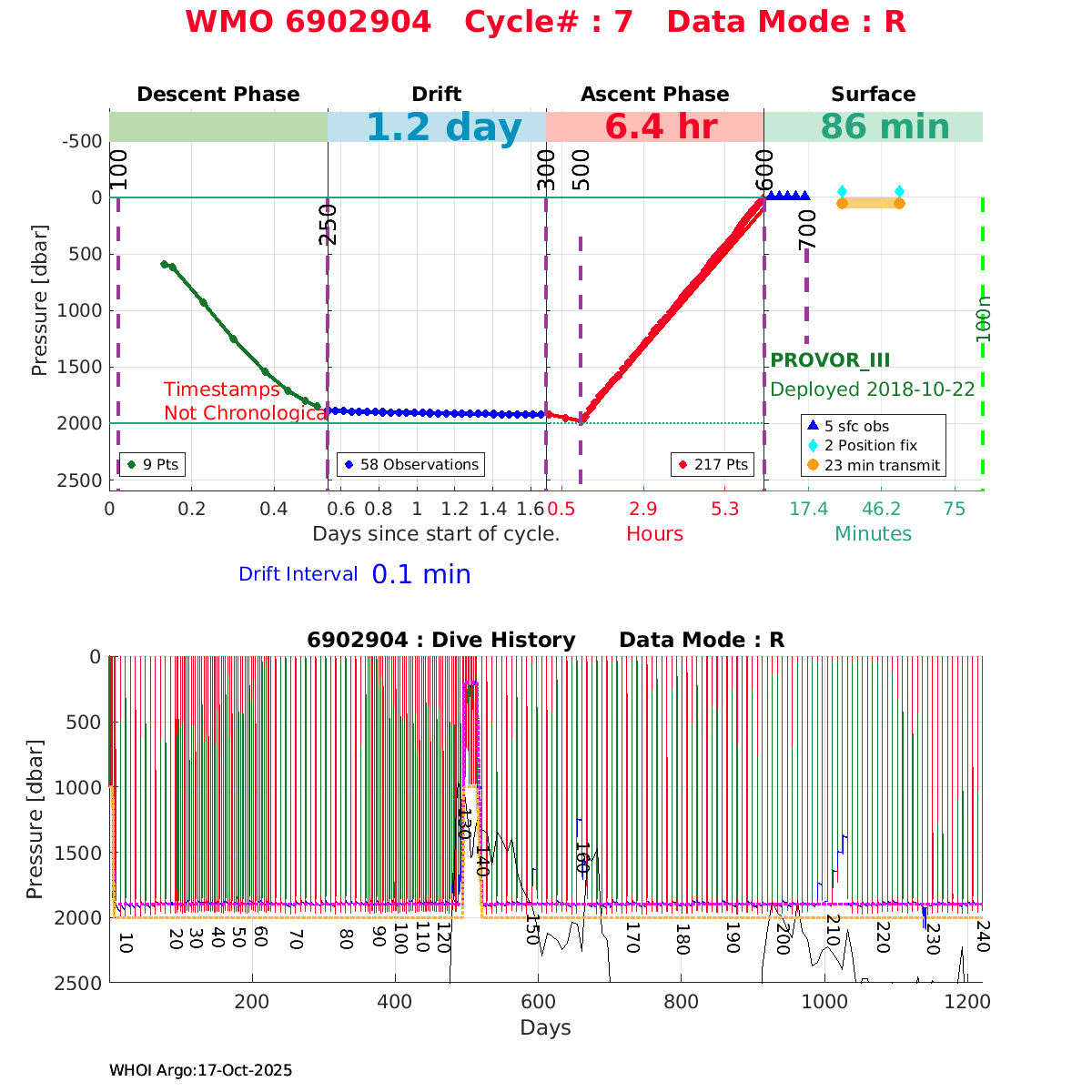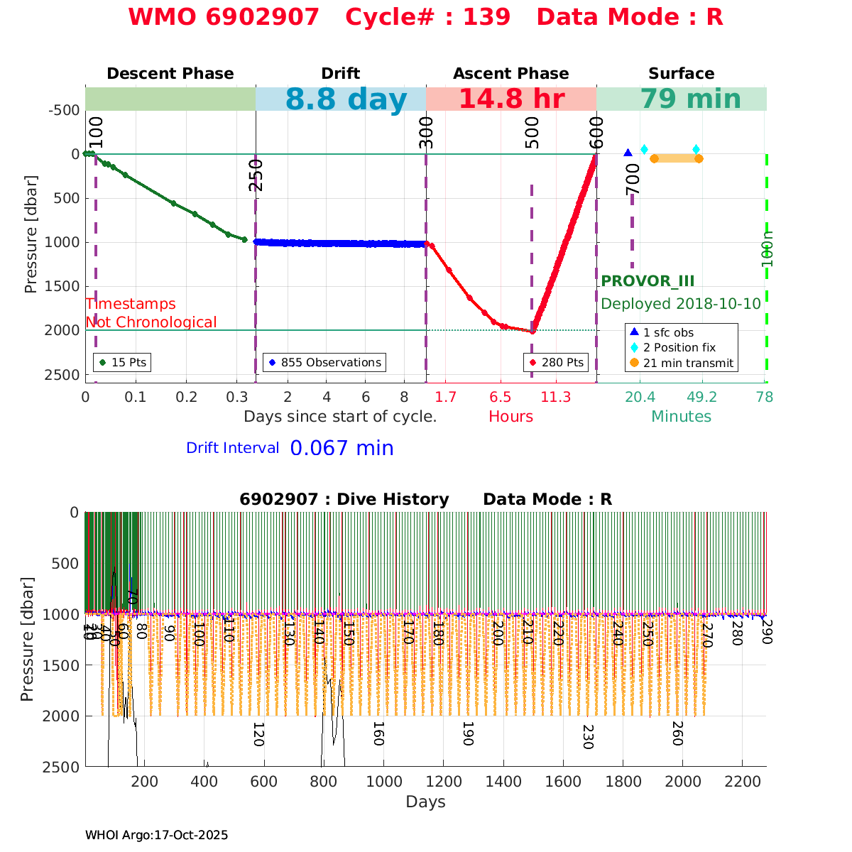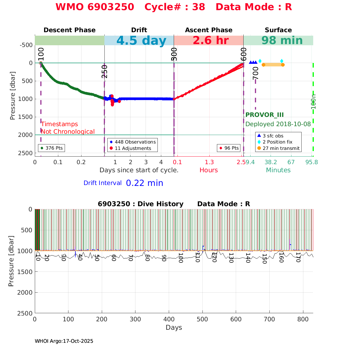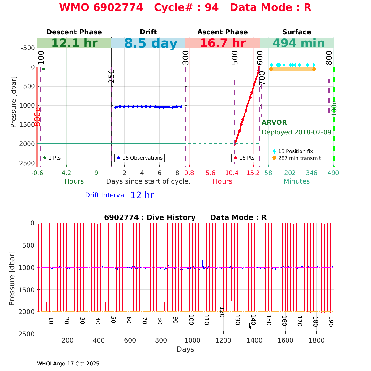 | WMO: #6902898 DAC: coriolis PI: Fabrizio D'ORTENZIO PROVOR_III: # KISTLER_2900PSIA: #2099901 SBE41CP: #4443 SATLANTIC_OCR504_ICSW: #40219 ECO_FLBBCD: #2439 Altimeter Comparison (IFREMER) EuroArgo Link | ![]() |
