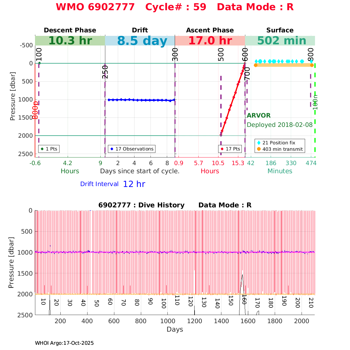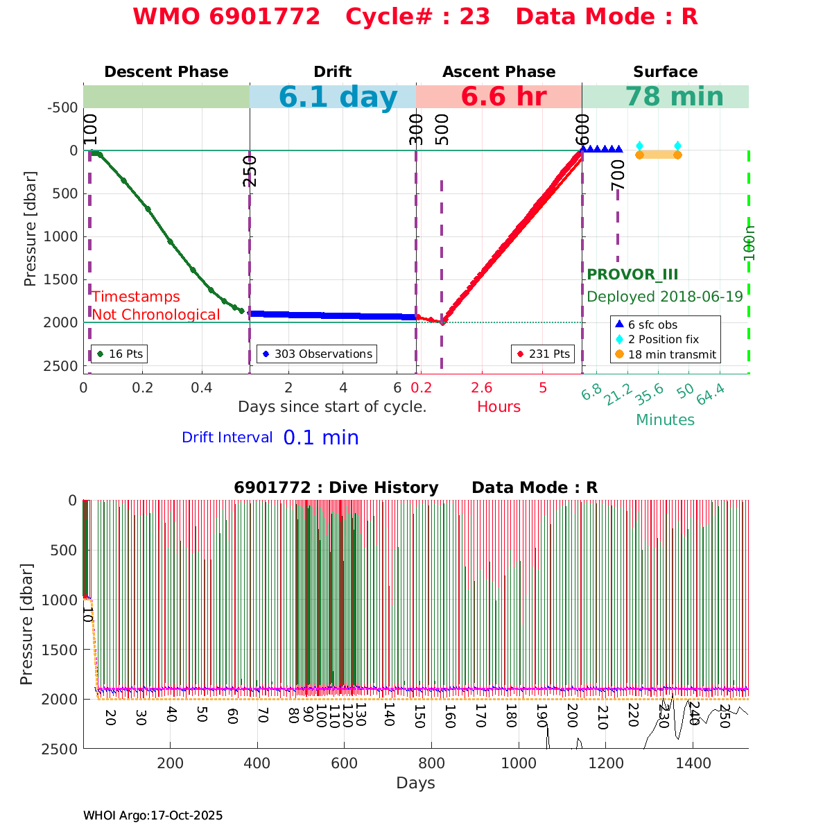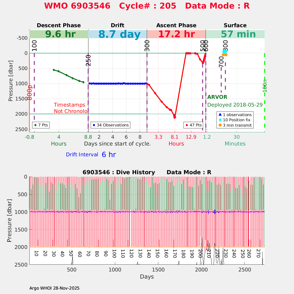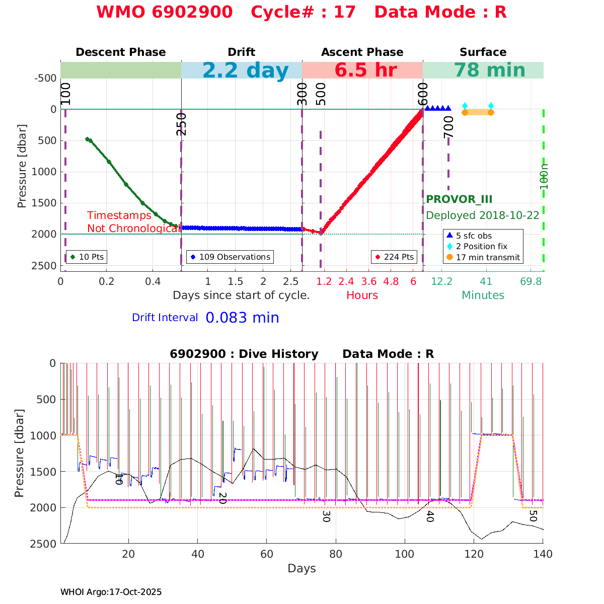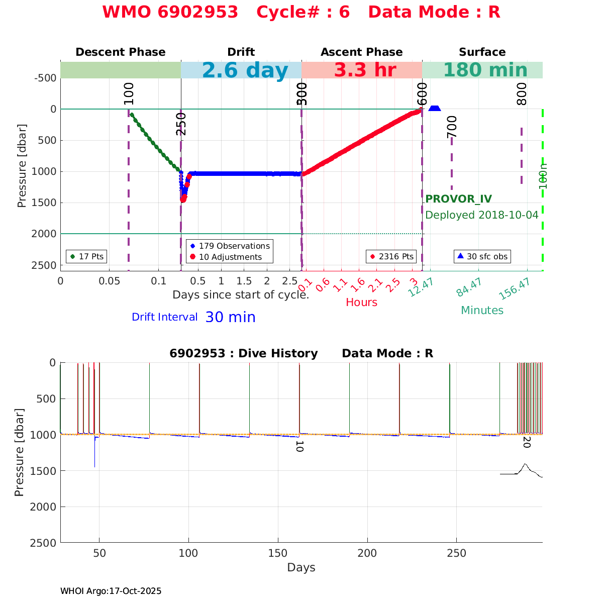 | WMO: #6902898 DAC: coriolis PI: Fabrizio D'ORTENZIO PROVOR_III: # KISTLER_2900PSIA: #2099901 SBE41CP: #4443 SATLANTIC_OCR504_ICSW: #40219 ECO_FLBBCD: #2439 Altimeter Comparison (IFREMER) EuroArgo Link | ![]() |