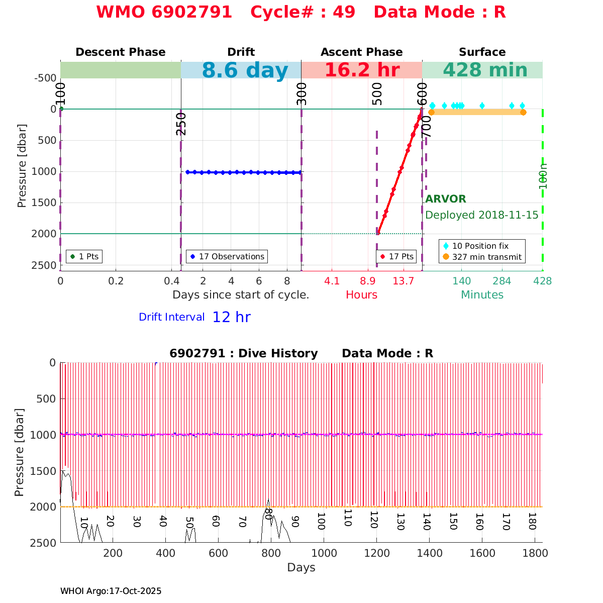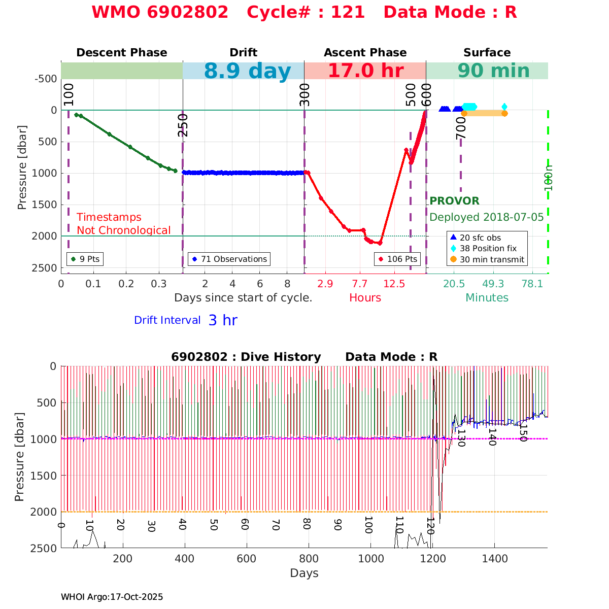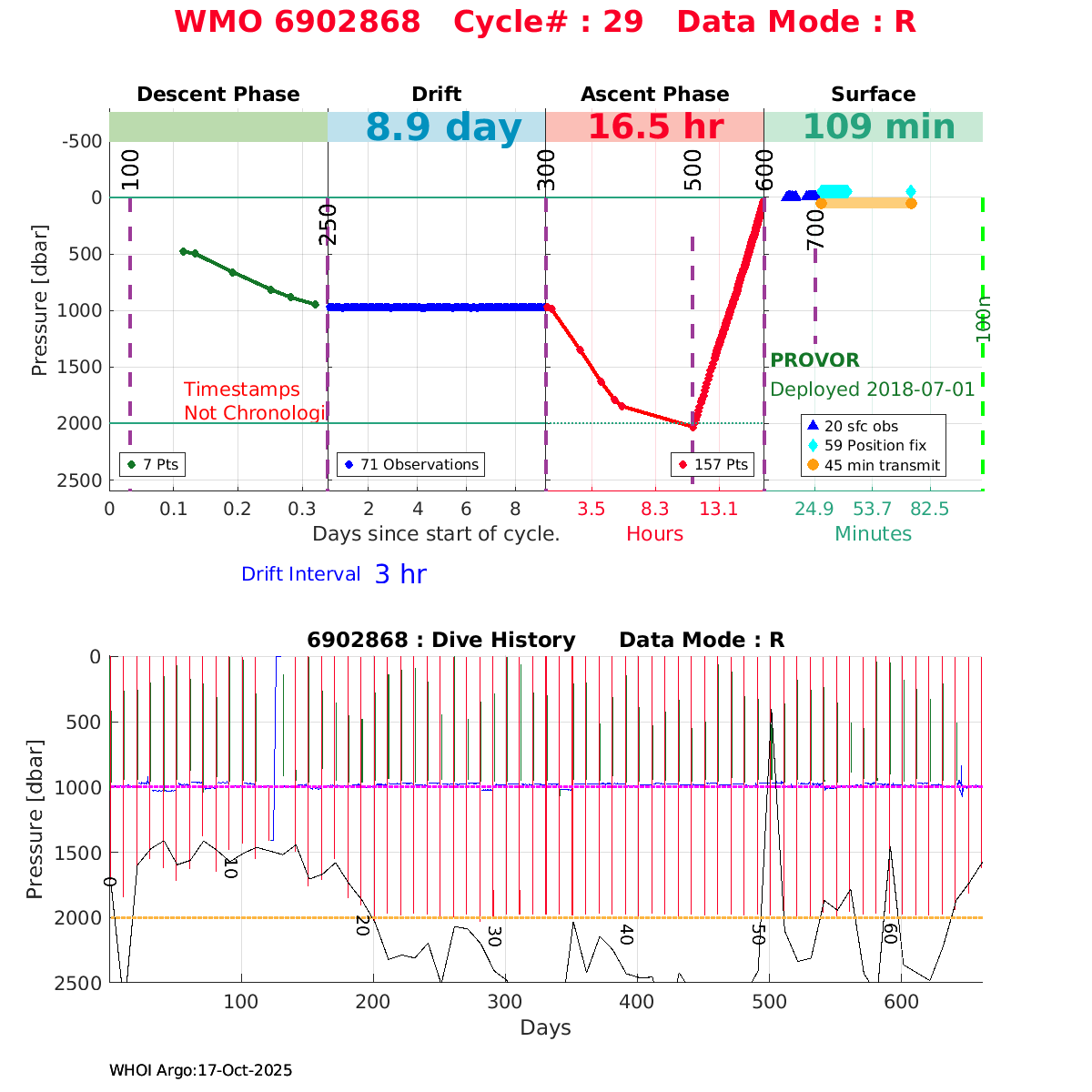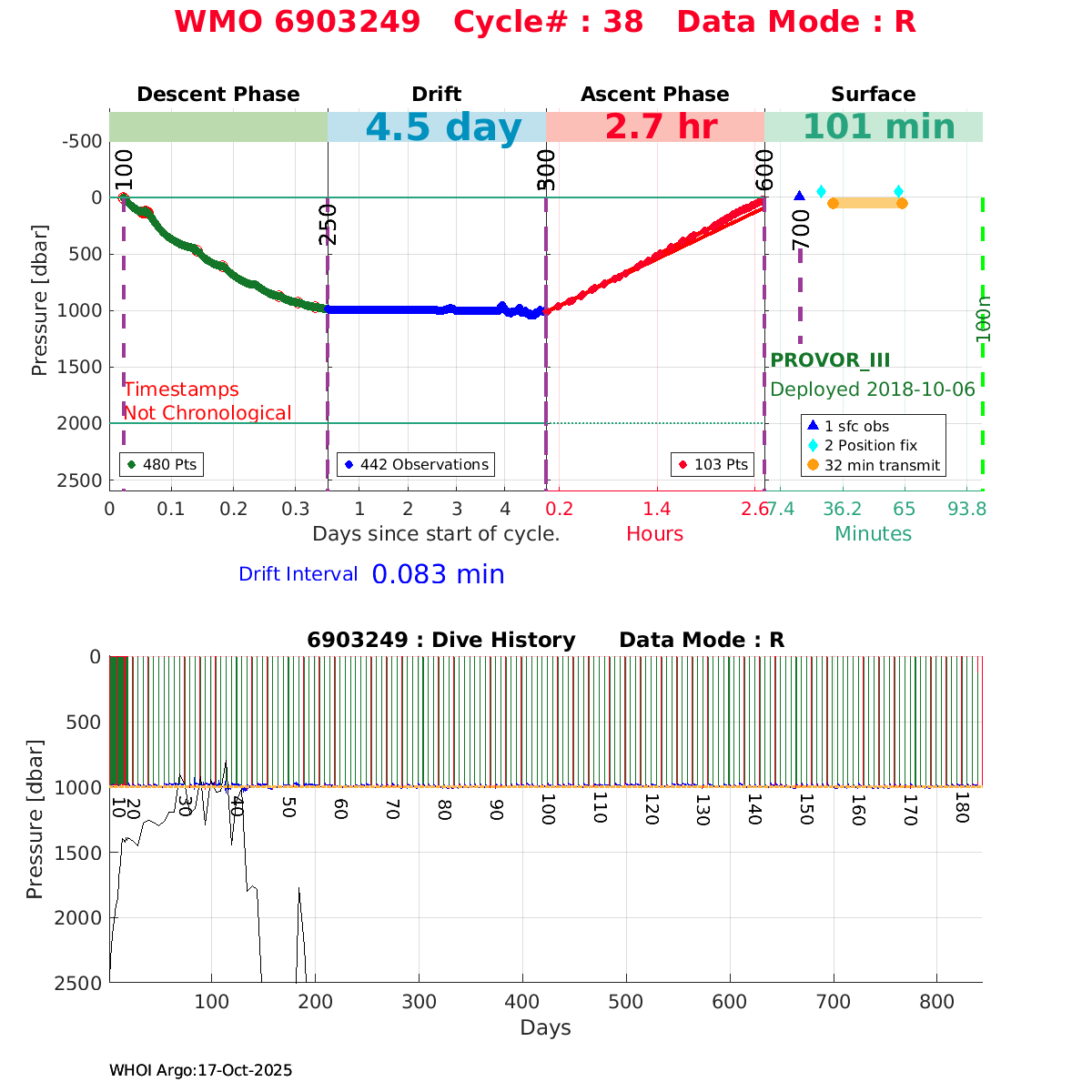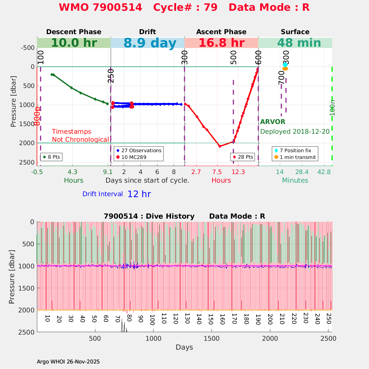 | WMO: #6902898 DAC: coriolis PI: Fabrizio D'ORTENZIO PROVOR_III: # KISTLER_2900PSIA: #2099901 SBE41CP: #4443 SATLANTIC_OCR504_ICSW: #40219 ECO_FLBBCD: #2439 Altimeter Comparison (IFREMER) EuroArgo Link | ![]() |