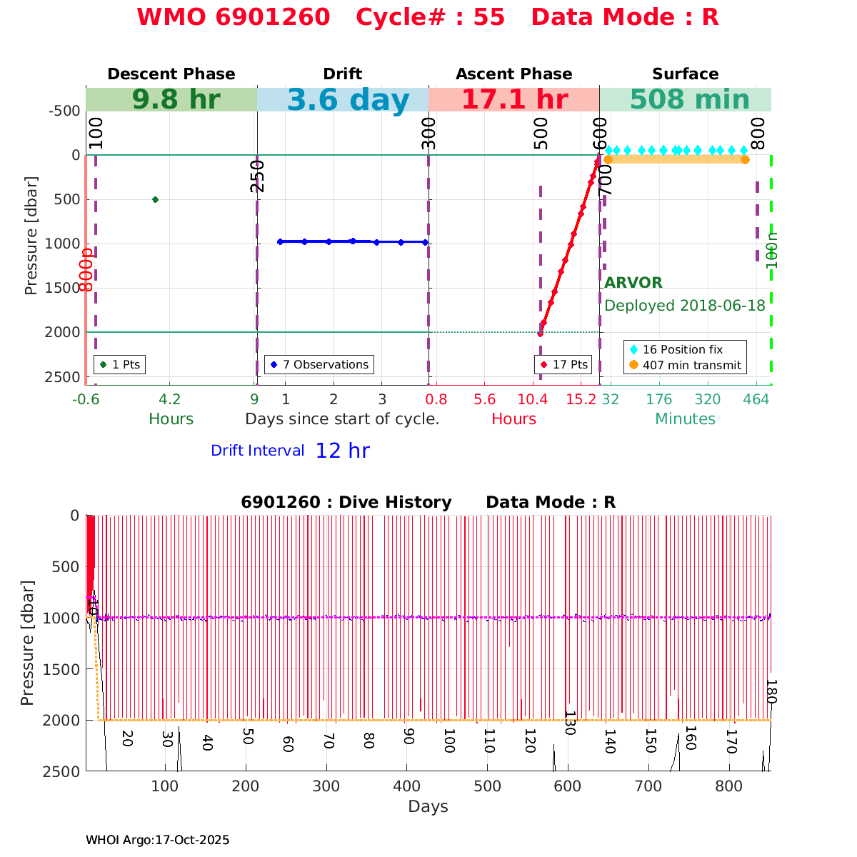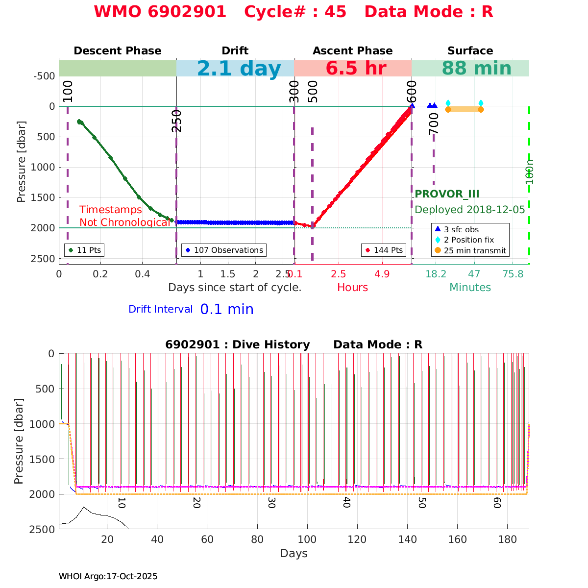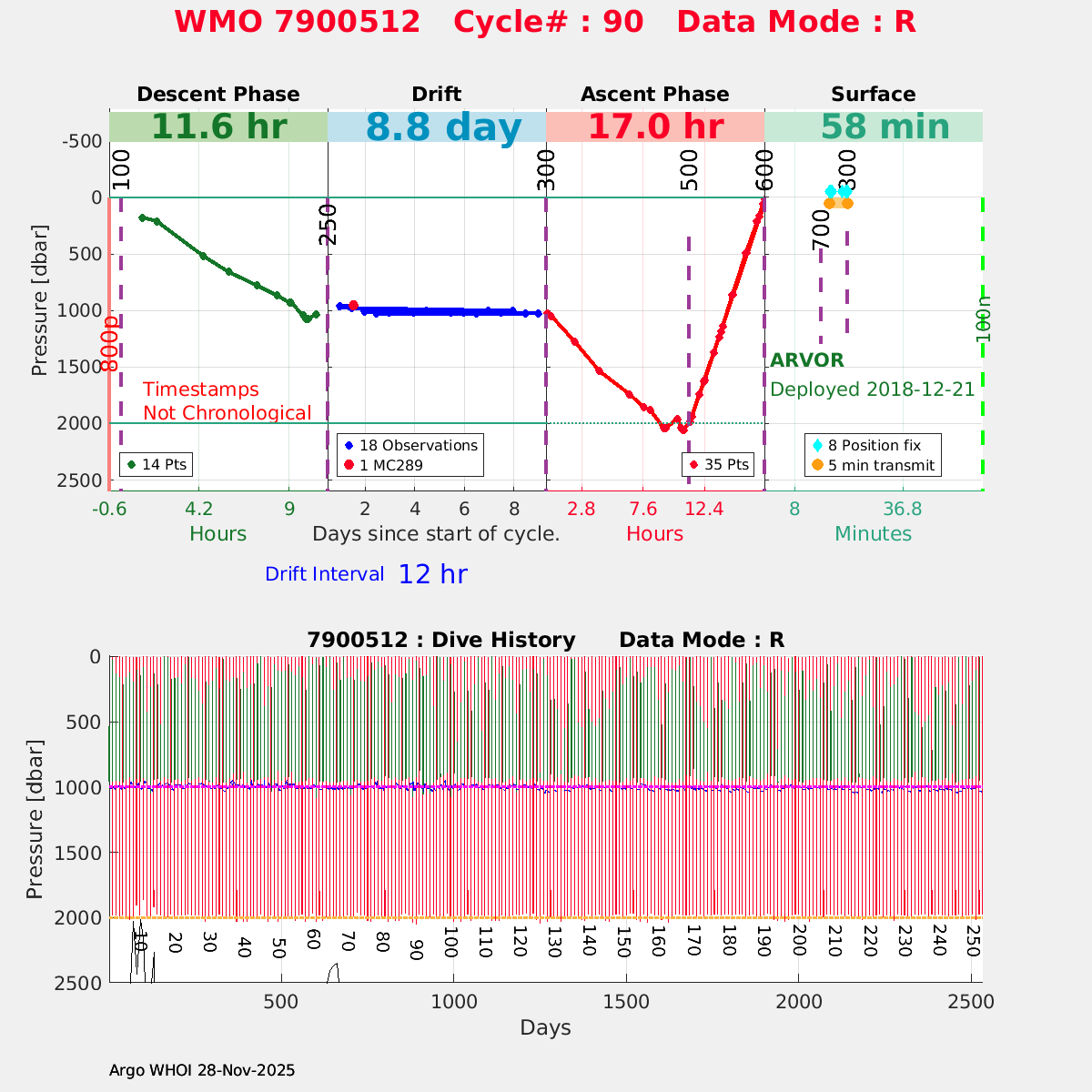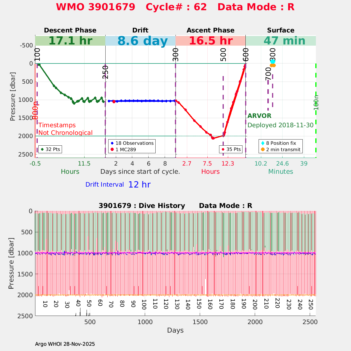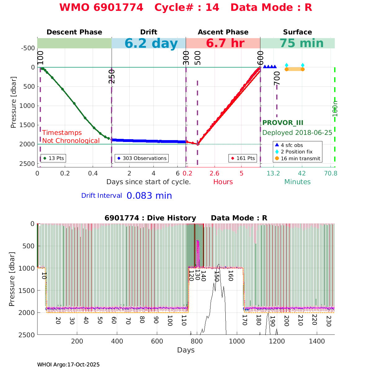 | WMO: #6902898 DAC: coriolis PI: Fabrizio D'ORTENZIO PROVOR_III: # KISTLER_2900PSIA: #2099901 SBE41CP: #4443 SATLANTIC_OCR504_ICSW: #40219 ECO_FLBBCD: #2439 Altimeter Comparison (IFREMER) EuroArgo Link | ![]() |