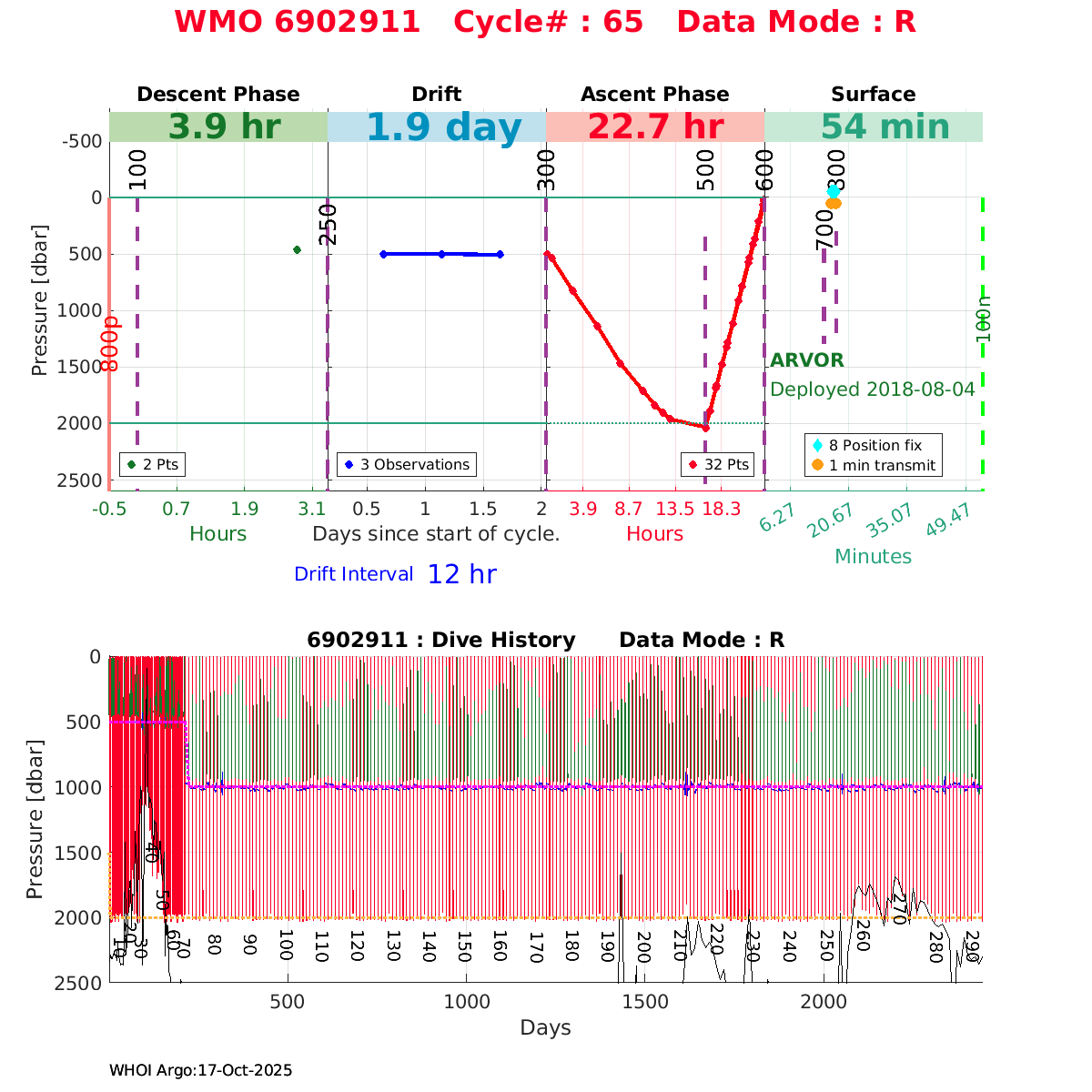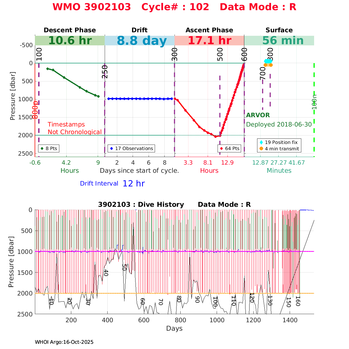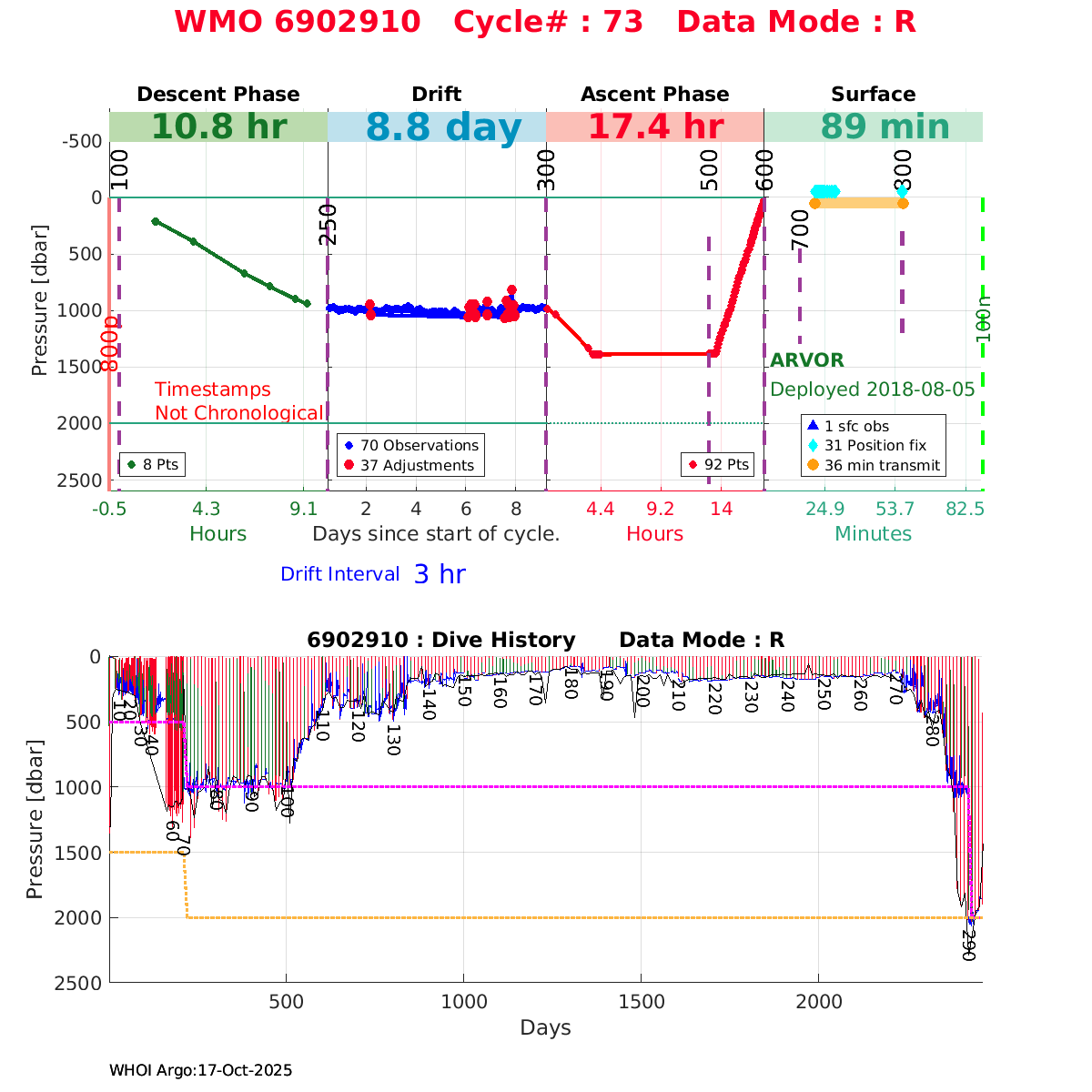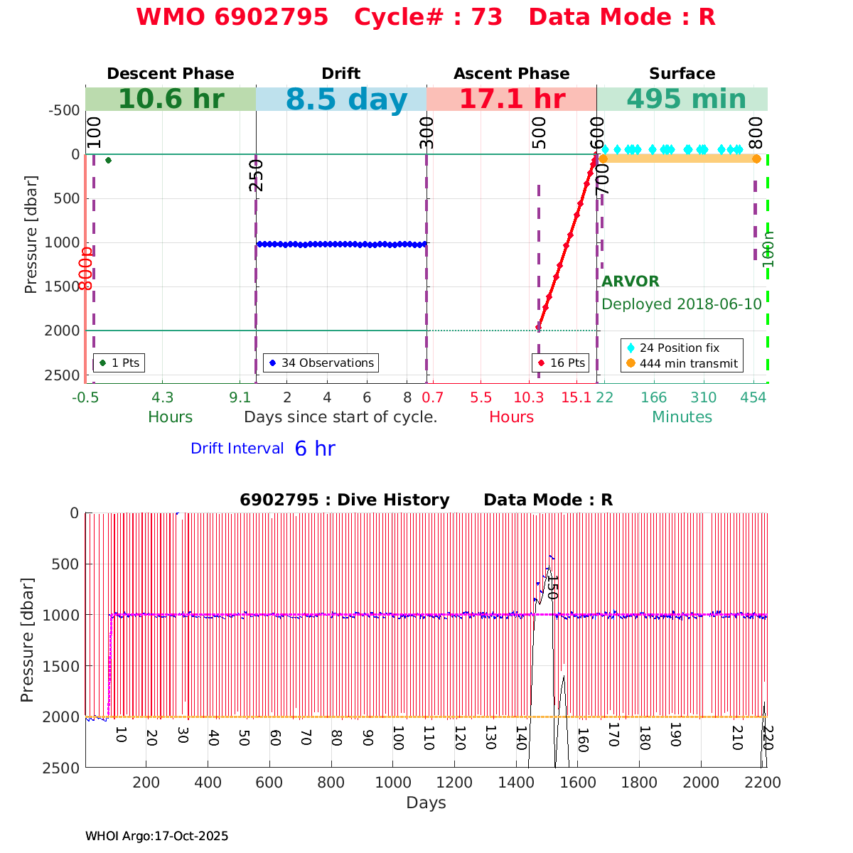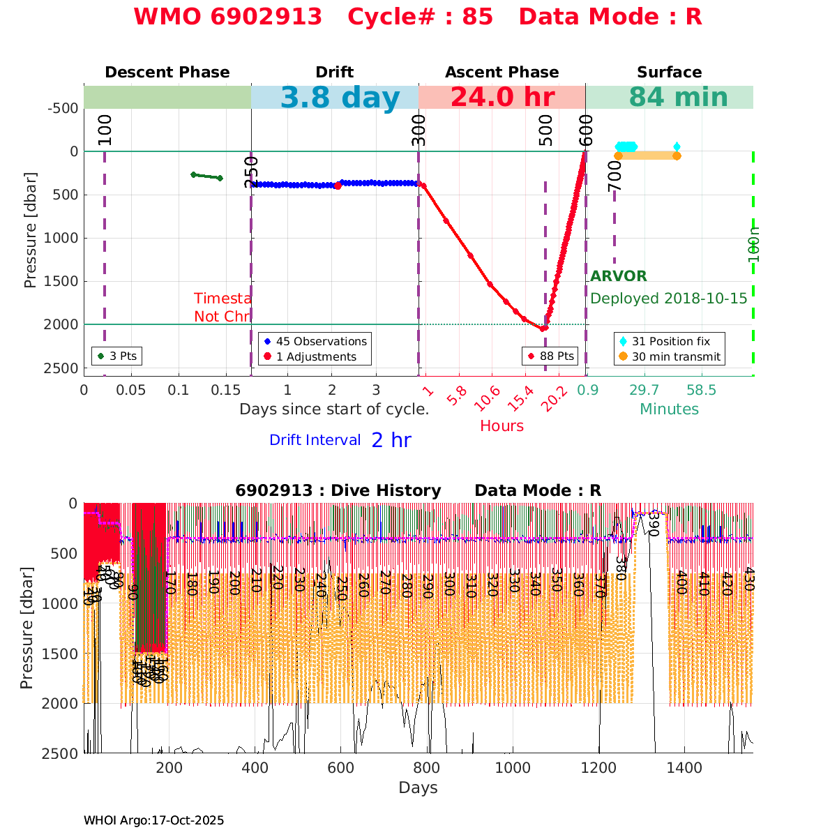 | WMO: #6902898 DAC: coriolis PI: Fabrizio D'ORTENZIO PROVOR_III: # KISTLER_2900PSIA: #2099901 SBE41CP: #4443 SATLANTIC_OCR504_ICSW: #40219 ECO_FLBBCD: #2439 Altimeter Comparison (IFREMER) EuroArgo Link | ![]() |