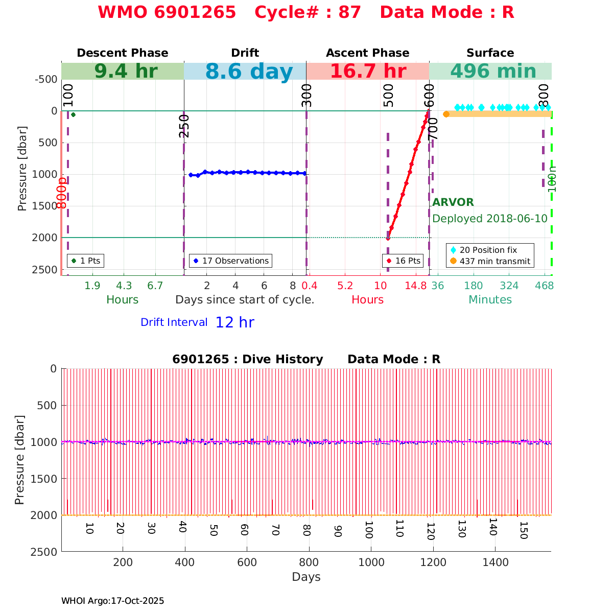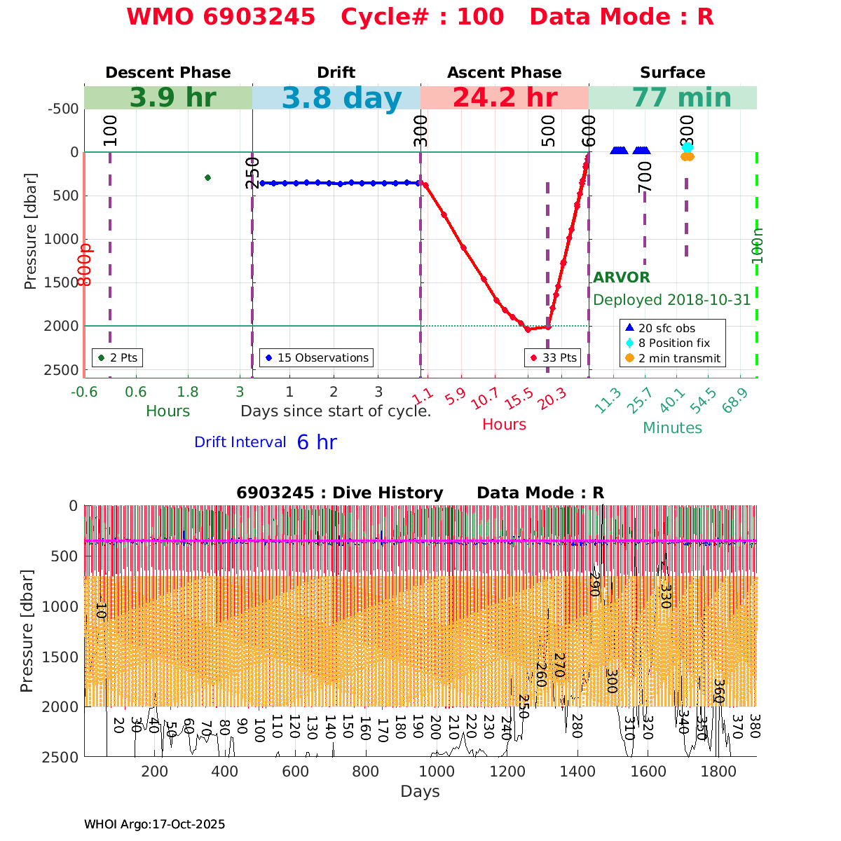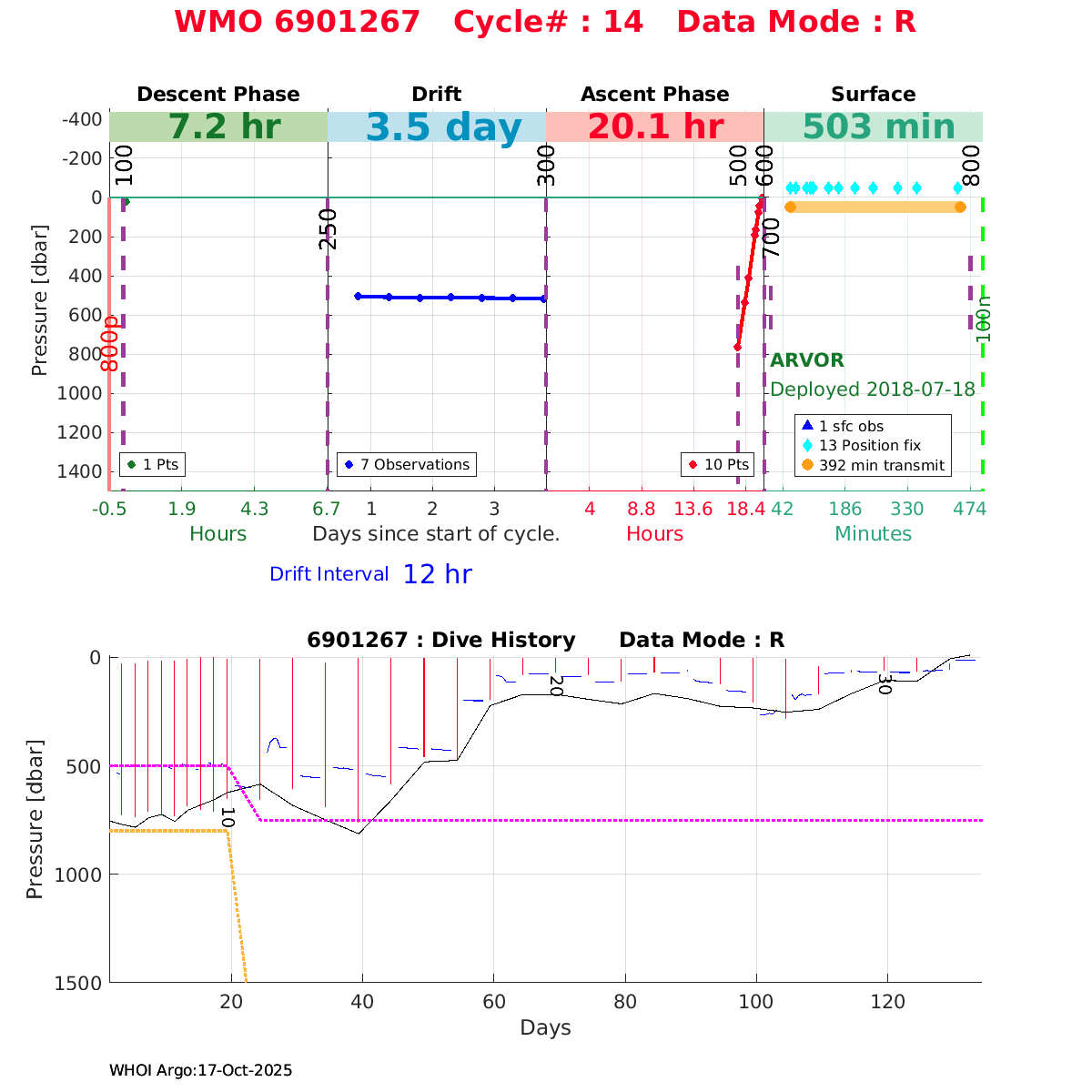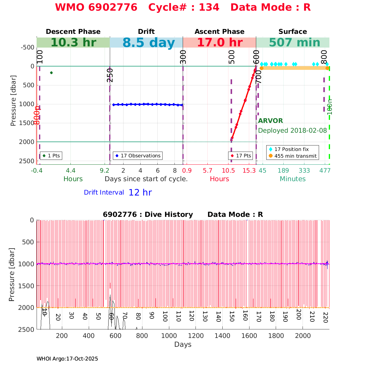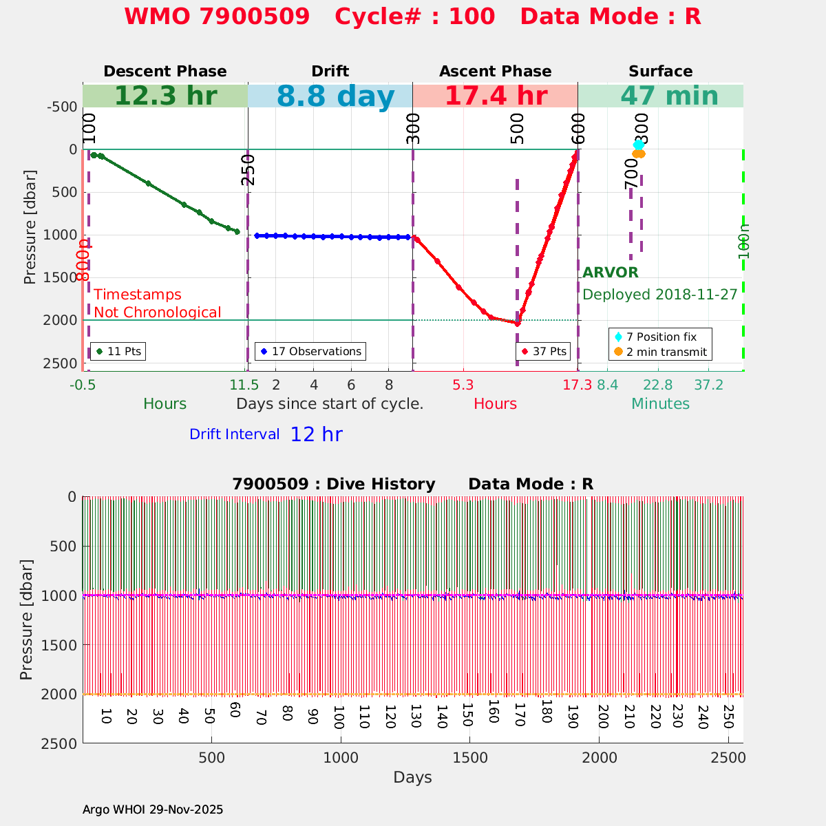 | WMO: #6902898 DAC: coriolis PI: Fabrizio D'ORTENZIO PROVOR_III: # KISTLER_2900PSIA: #2099901 SBE41CP: #4443 SATLANTIC_OCR504_ICSW: #40219 ECO_FLBBCD: #2439 Altimeter Comparison (IFREMER) EuroArgo Link | ![]() |