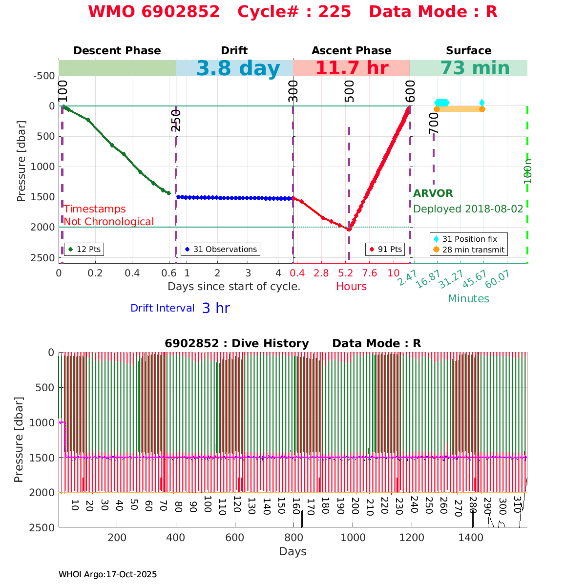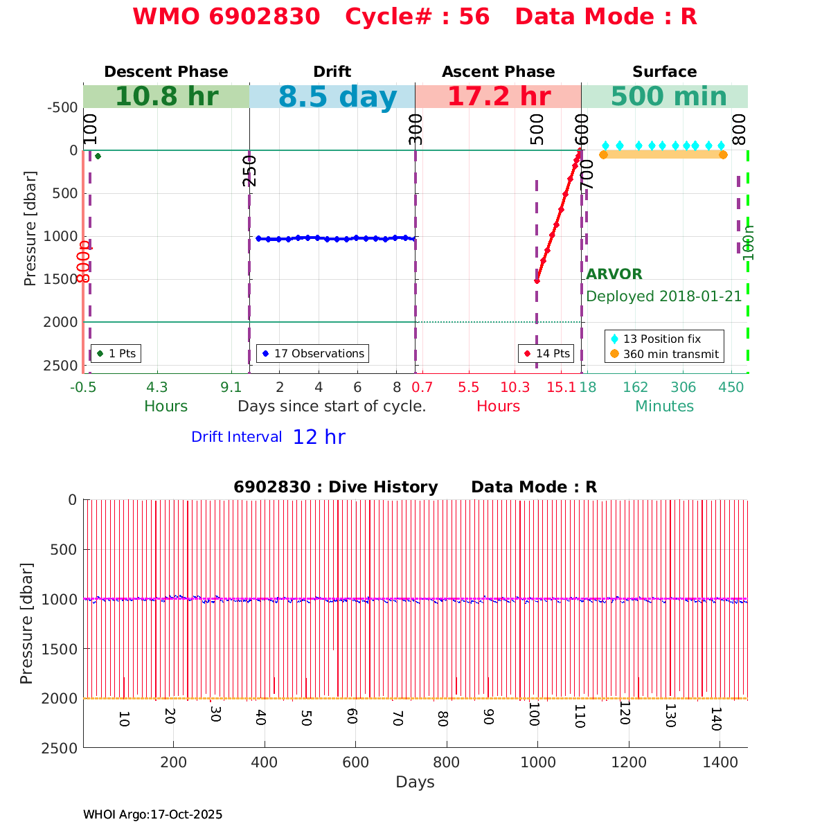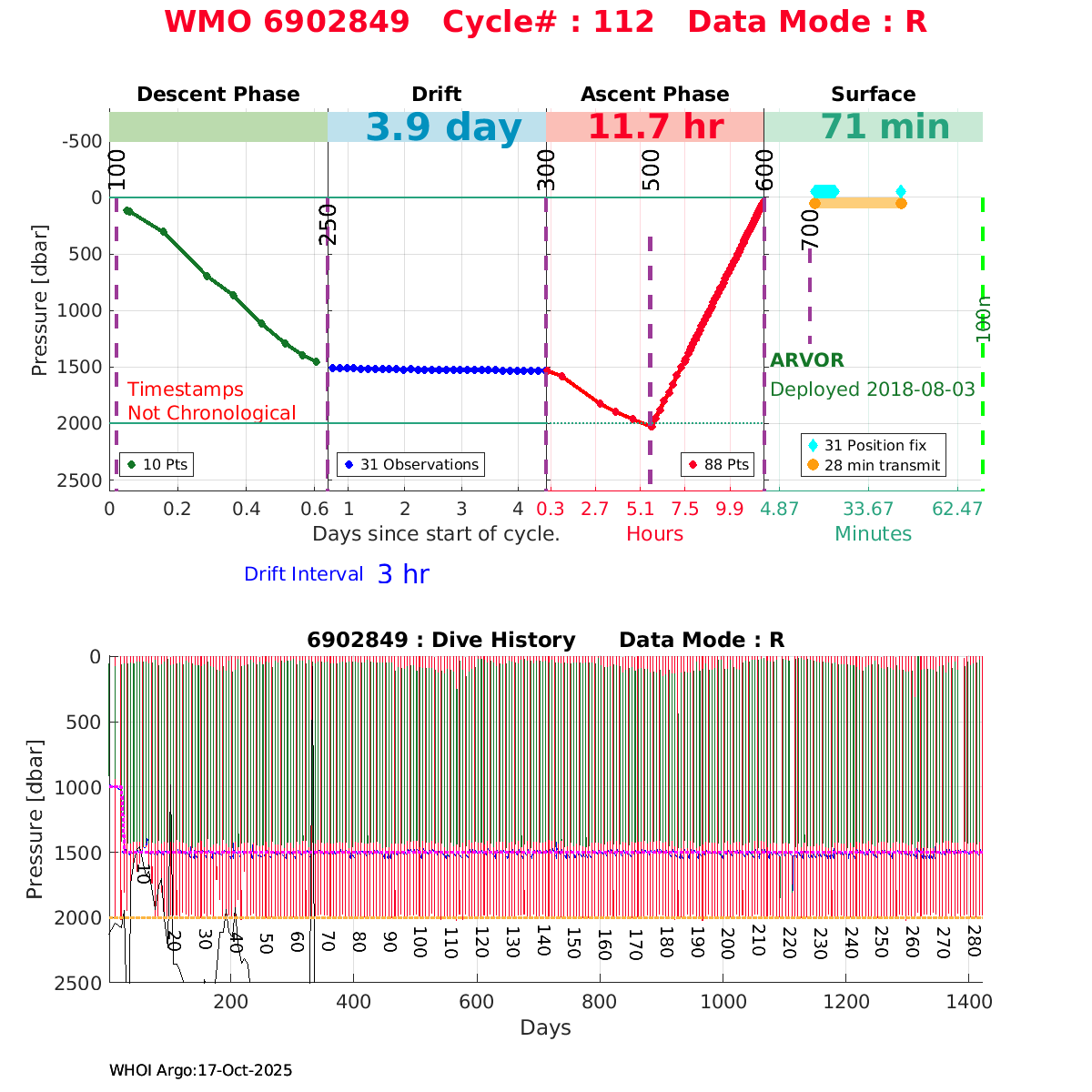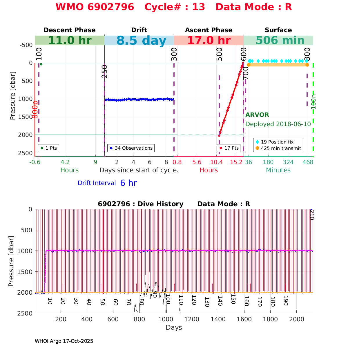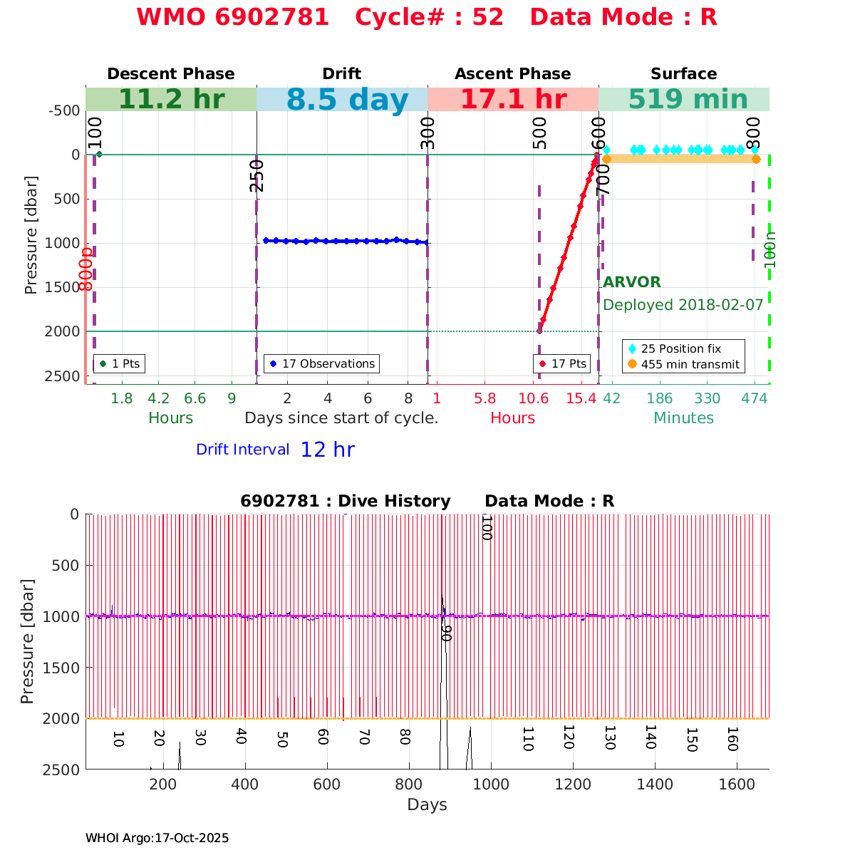 | WMO: #6902851 DAC: coriolis PI: Fabrizio D'ORTENZIO ARVOR: # FLOATCLOCK: # DRUCK_2900PSIA: #10596223 SBE41CP_V7.2.5: #9601 Altimeter Comparison (IFREMER) EuroArgo Link | ![]() |