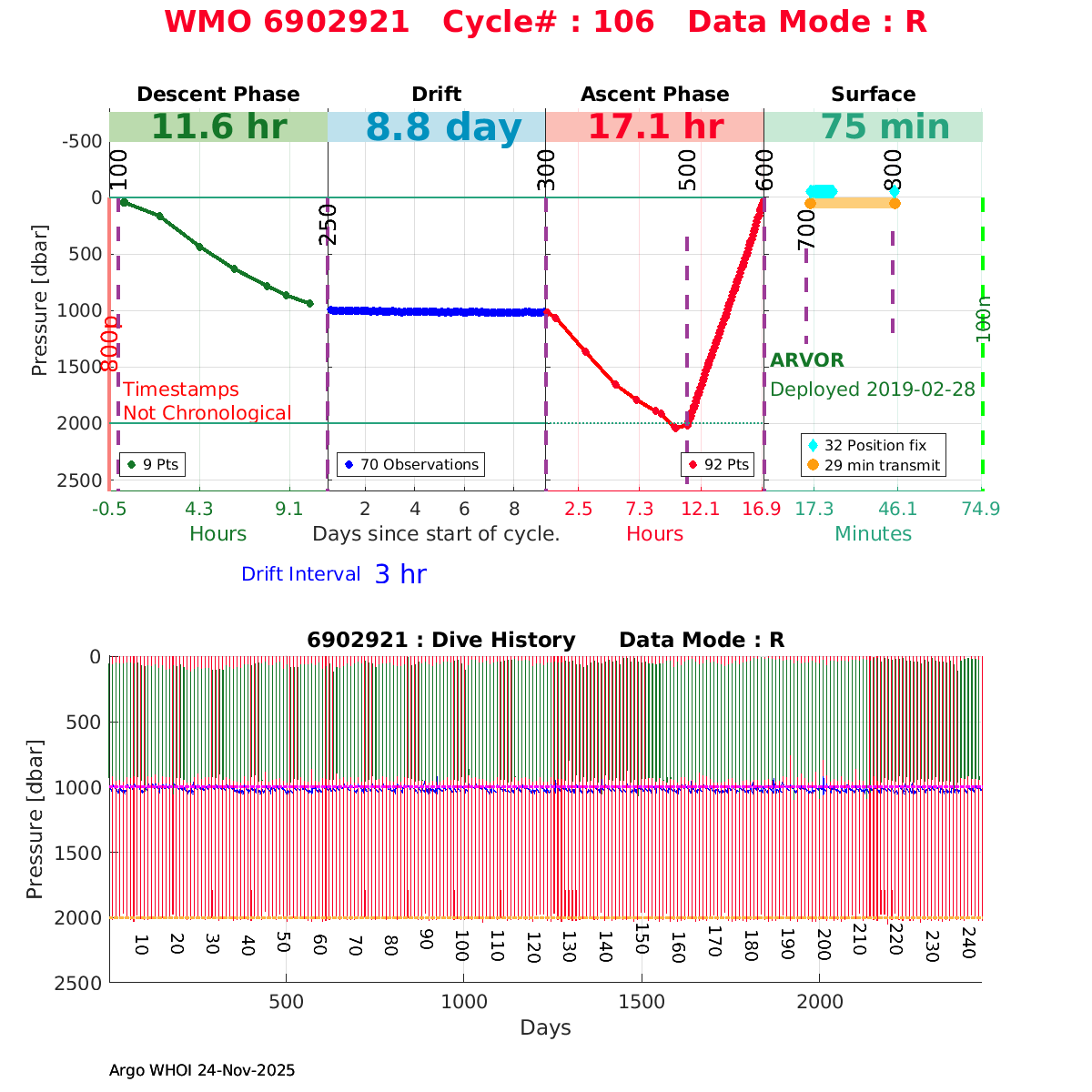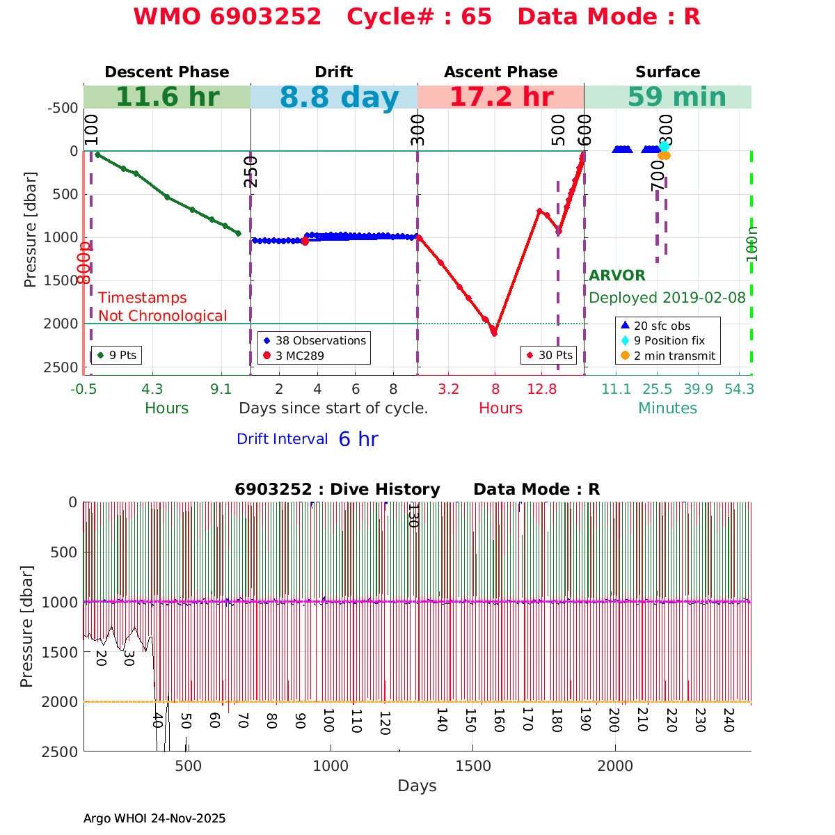 | WMO: #6902989 DAC: coriolis PI: Christophe MAES ARVOR: # FLOATCLOCK: # DRUCK_2900PSIA: #11216666 SBE41CP: #11869 Altimeter Comparison (IFREMER) EuroArgo Link | ![]() |