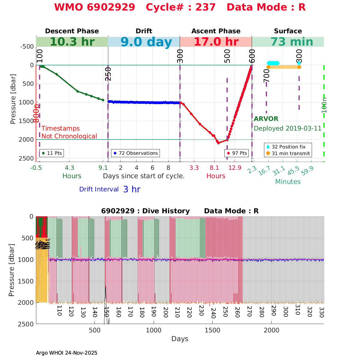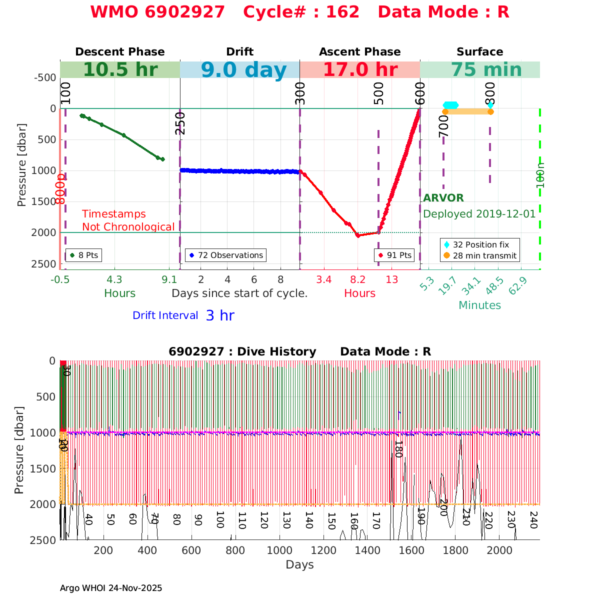| WMO: #6902927 DAC: coriolis PI: Christophe MAES ARVOR: # FLOATCLOCK: # DRUCK_2900PSIA: #10790968 SBE41CP: #10773 Altimeter Comparison (IFREMER) EuroArgo Link | ![]() |