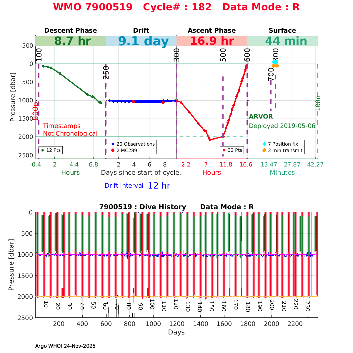 | WMO: #7900537 DAC: coriolis PI: Birgit KLEIN ARVOR: # FLOATCLOCK: # DRUCK_2900PSIA: #11129854 SBE41CP: #11619 Altimeter Comparison (IFREMER) EuroArgo Link | ![]() |