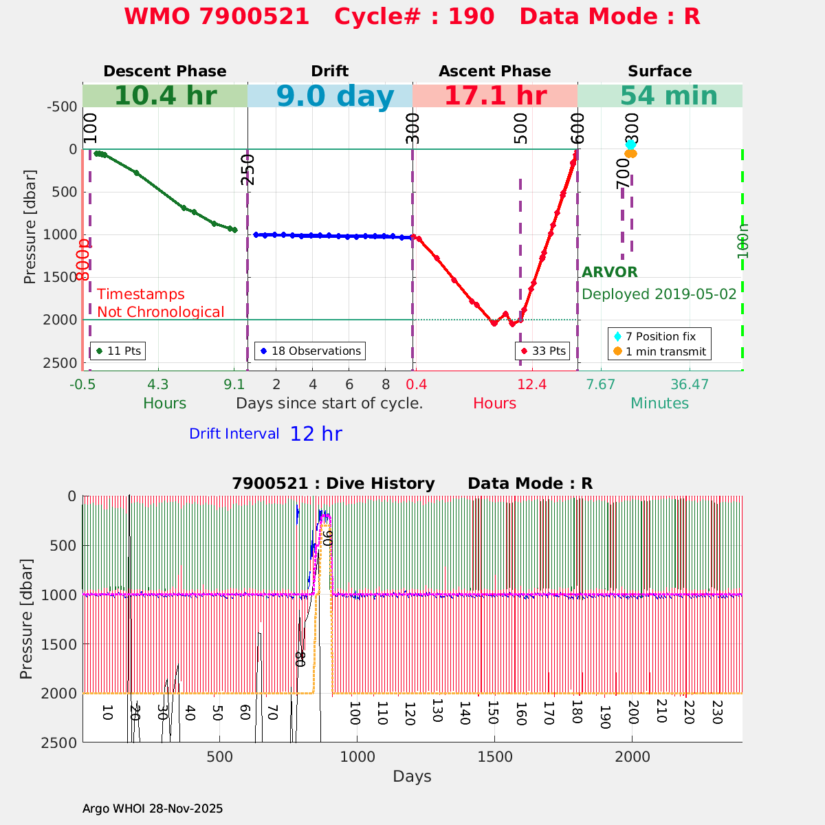 | WMO: #7900521 DAC: coriolis PI: Birgit KLEIN ARVOR: # FLOATCLOCK: # DRUCK_2900PSIA: #11129116 SBE41CP: #11684 Altimeter Comparison (IFREMER) EuroArgo Link | ![]() |