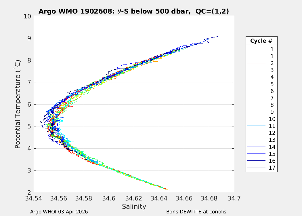 | WMO: #1902608 DAC: coriolis PI: Boris DEWITTE ARVOR: # FLOATCLOCK: # DRUCK_2900PSIA: #12320490 SBE41CP: #18509 Altimeter Comparison (IFREMER) EuroArgo Link | ![]() |