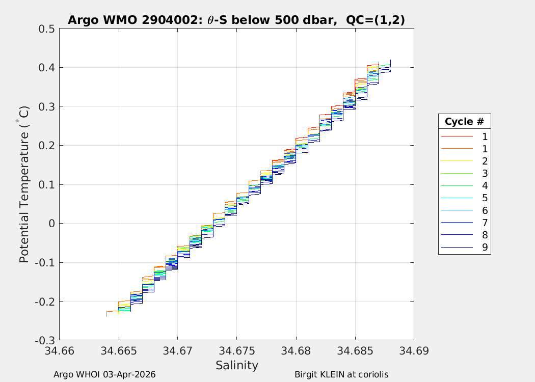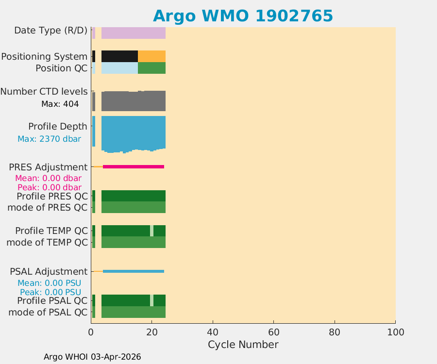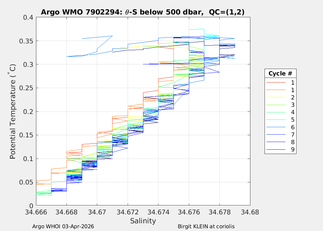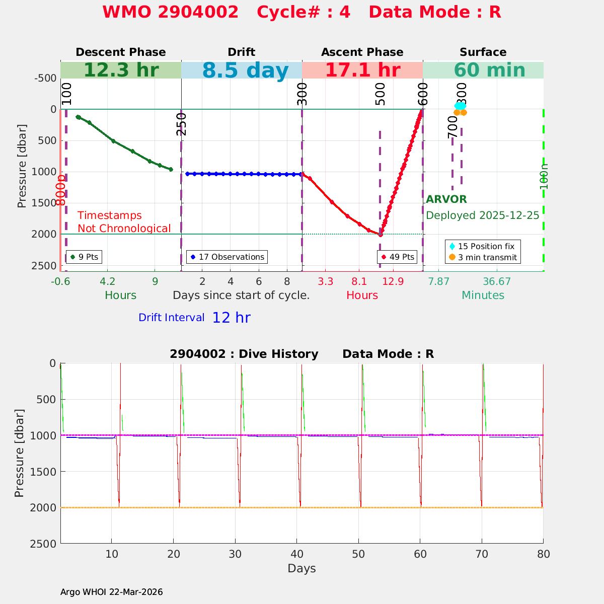 | WMO: #2904002 DAC: coriolis PI: Birgit KLEIN ARVOR: # FLOATCLOCK: # DRUCK_2900PSIA: #12650678 SBE41CP_V7.2.5: #21611 Altimeter Comparison (IFREMER) EuroArgo Link | ![]() |