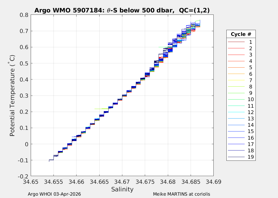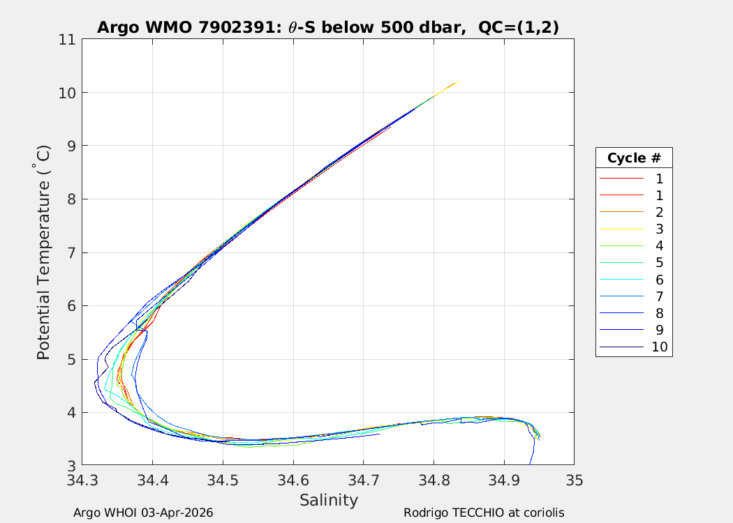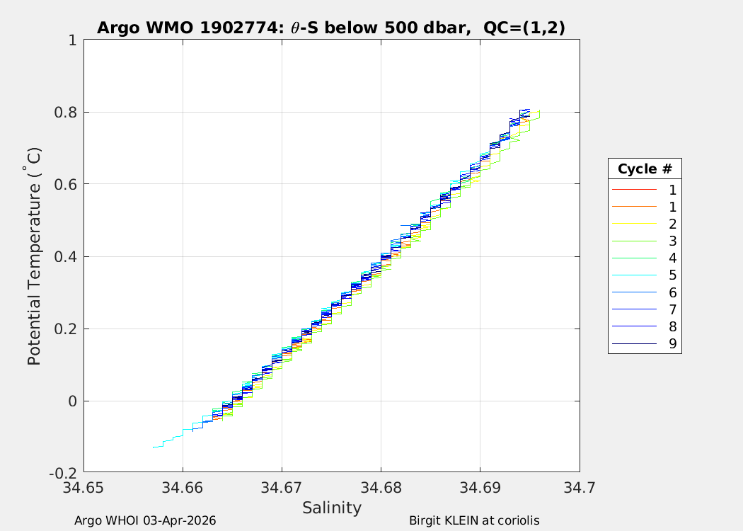 | WMO: #4903841 DAC: coriolis PI: Olaf BOEBEL APEX: #10368 FLOATCLOCK: # DRUCK_2900PSIA: #12414153 SBE41CP: #19392 Altimeter Comparison (IFREMER) EuroArgo Link | ![]() |
