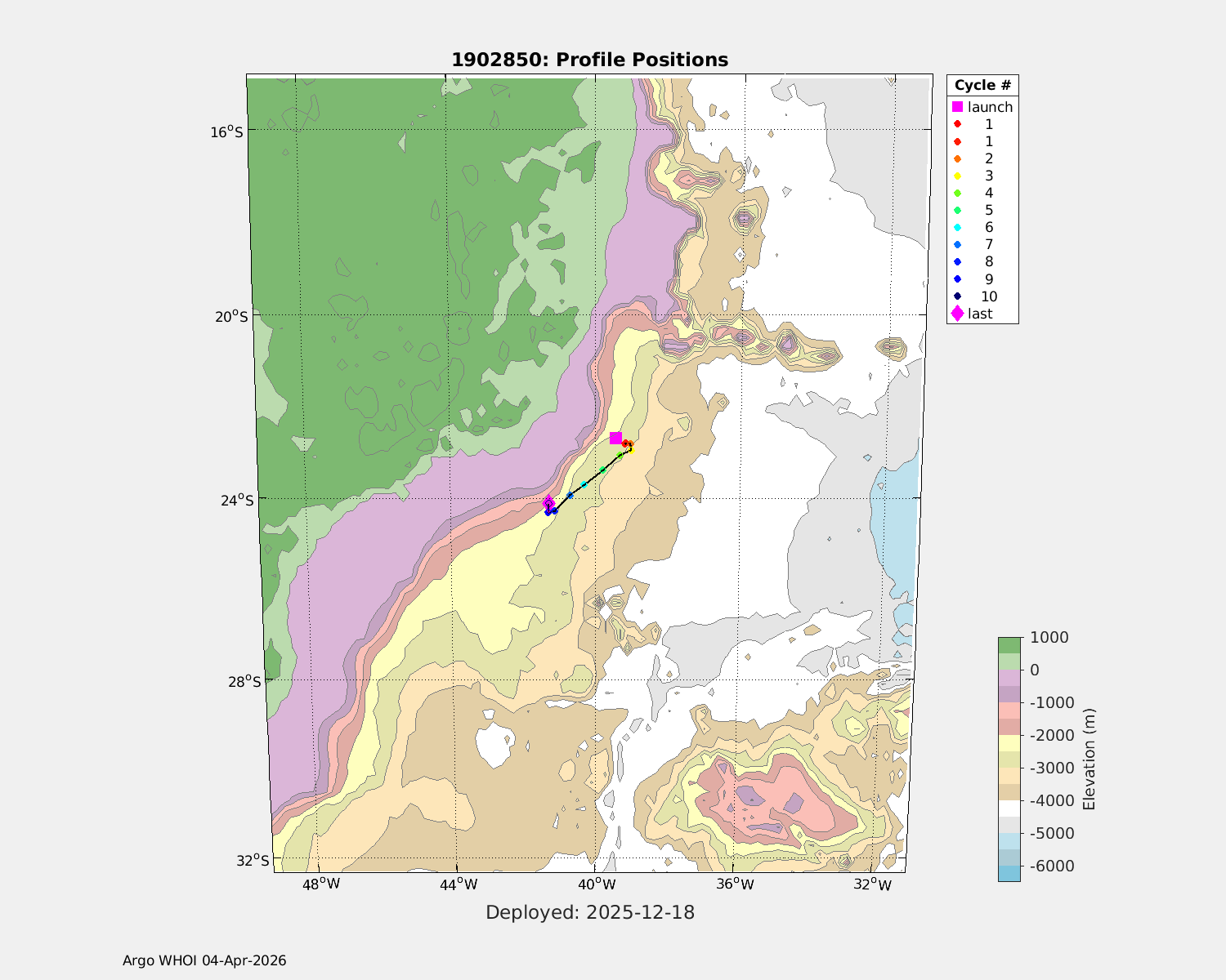 | WMO: #1902735 DAC: coriolis PI: Olaf BOEBEL APEX: #10365 FLOATCLOCK: # DRUCK_2900PSIA: #12414150 SBE41CP: #19389 Altimeter Comparison (IFREMER) EuroArgo Link | ![]() |