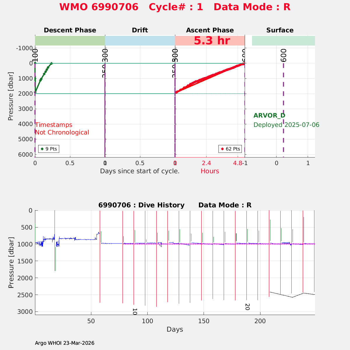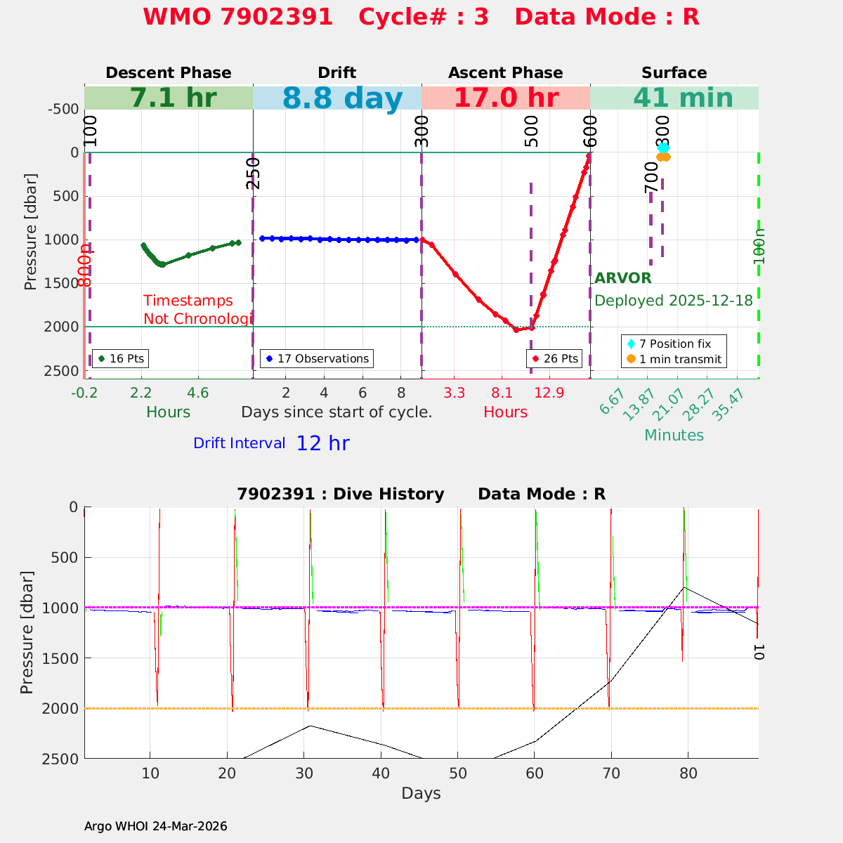 | WMO: #3902703 DAC: coriolis PI: Christine COATANOAN ARVOR: # FLOATCLOCK: # DRUCK_2900PSIA: #12602779 SBE41CP: #20674 Altimeter Comparison (IFREMER) EuroArgo Link | ![]() |