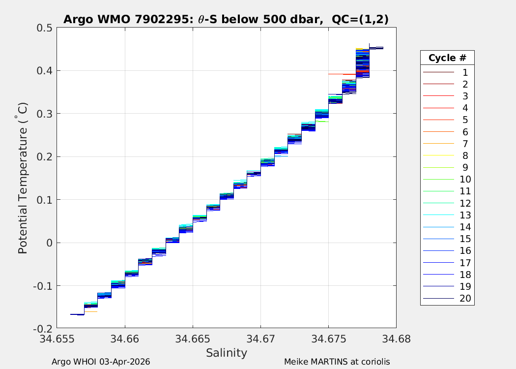 | WMO: #2903903 DAC: coriolis PI: Meike MARTINS ARVOR: # DRUCK_2900PSIA: #12504476 SBE41CP: #20287 AANDERAA_OPTODE_4330: #4349 Altimeter Comparison (IFREMER) EuroArgo Link | ![]() |