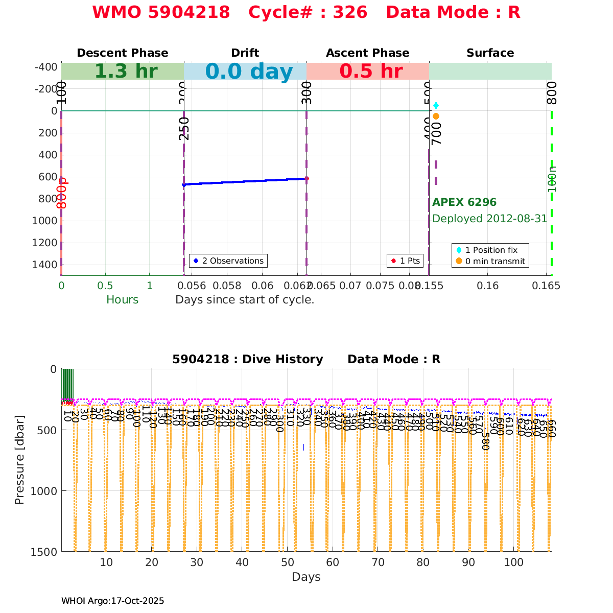 | WMO: #5903956 DAC: csiro PI: Susan Wijffels APEX: #4927 SBE41CP_V2: #3004 DRUCK: #3233092 AANDERAA_OPTODE_3830: #1231 Altimeter Comparison (IFREMER) EuroArgo Link | ![]() |