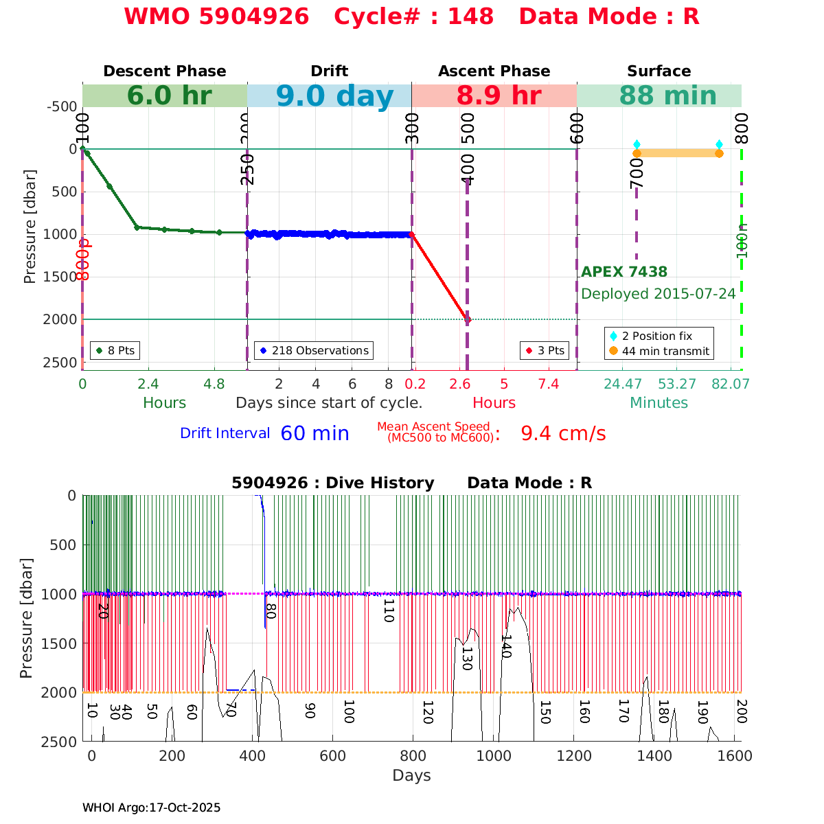 | WMO: #5904926 DAC: csiro PI: Susan Wijffels APEX: #7438 SBE41CP_V2: #7062 DRUCK: #4196065 Altimeter Comparison (IFREMER) EuroArgo Link | ![]() |