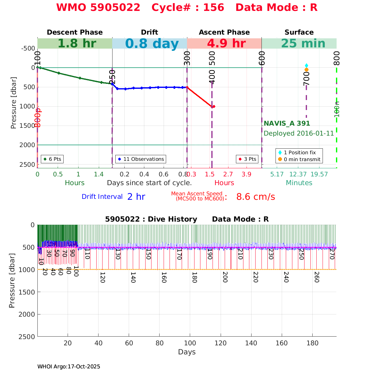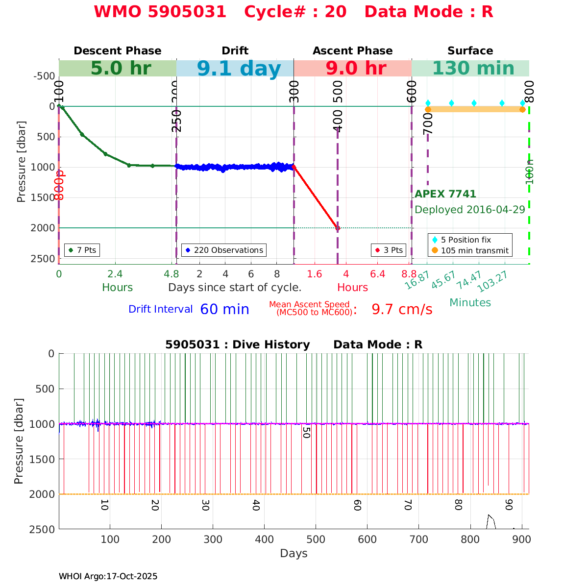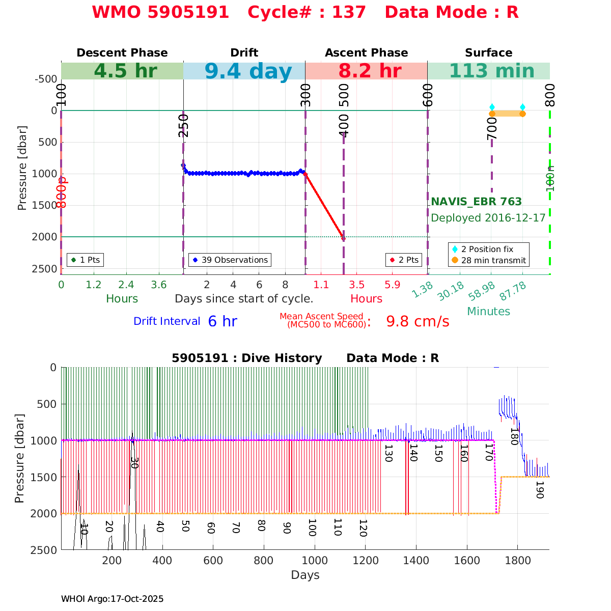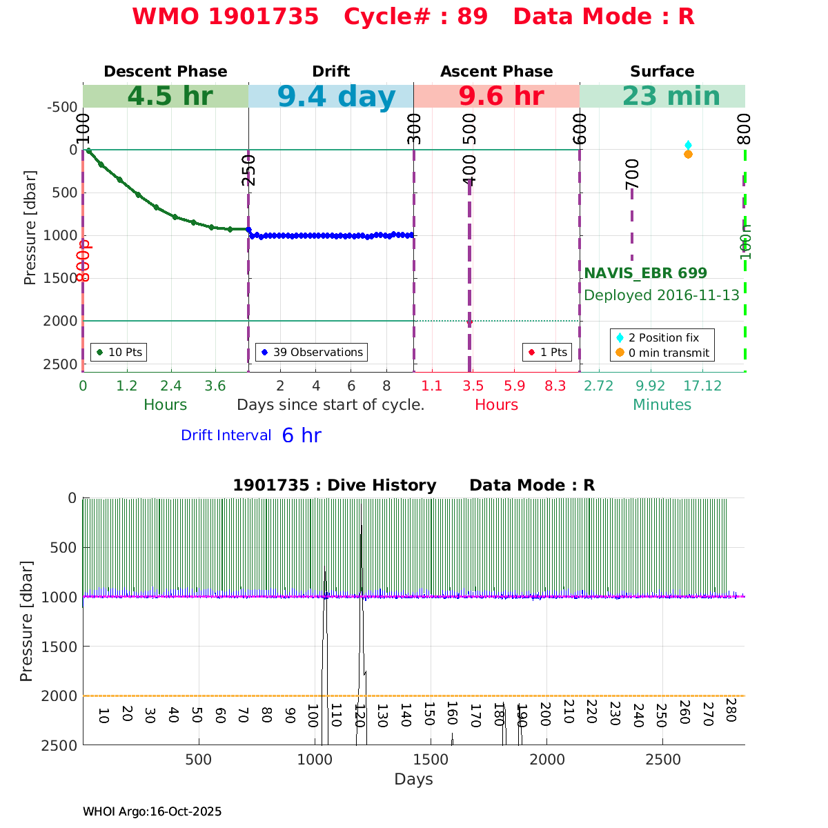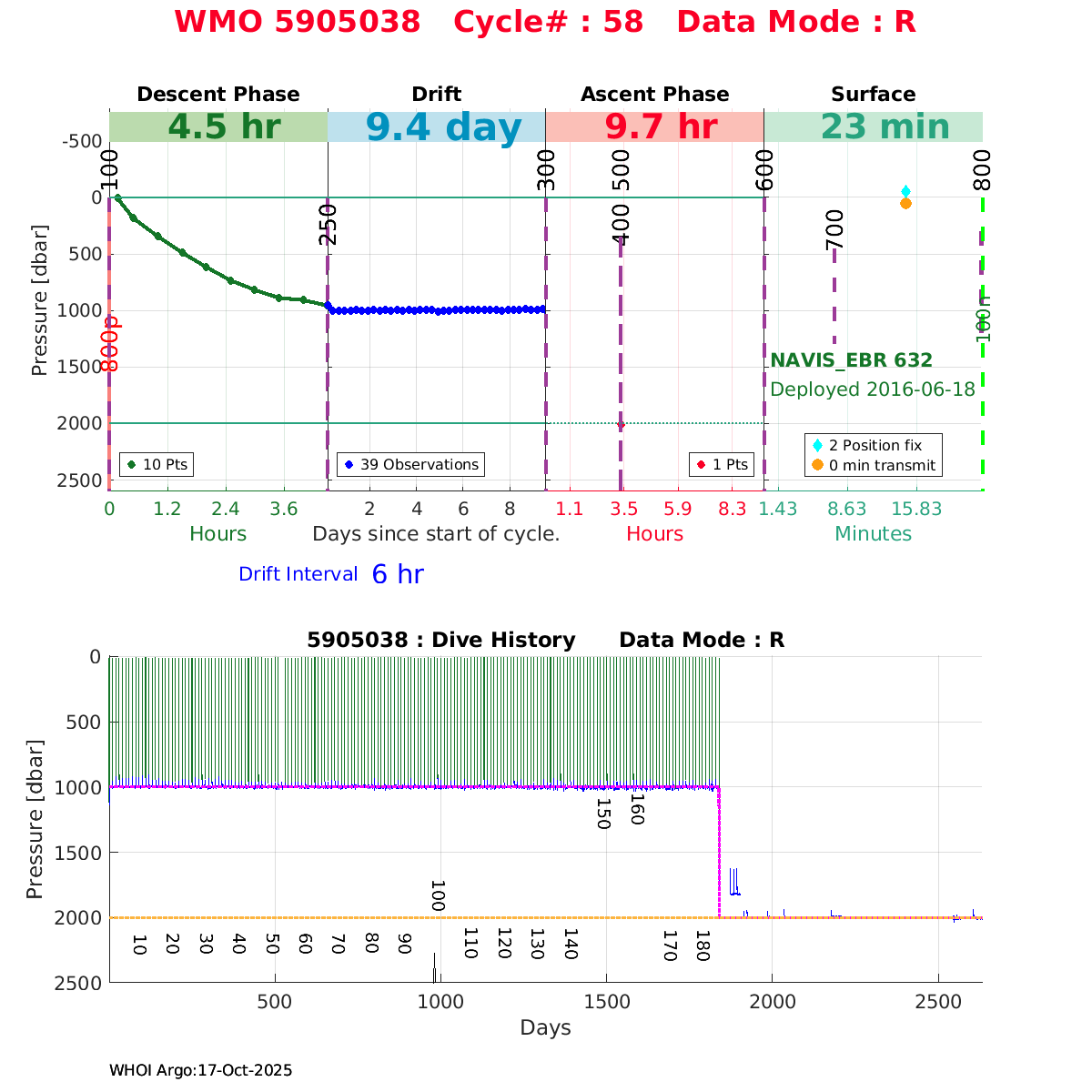 | WMO: #5905191 DAC: csiro PI: Susan Wijffels NAVIS_EBR: #763 SBE41CP_V7.2.5: #8633 DRUCK: #10300736 Altimeter Comparison (IFREMER) EuroArgo Link | ![]() |