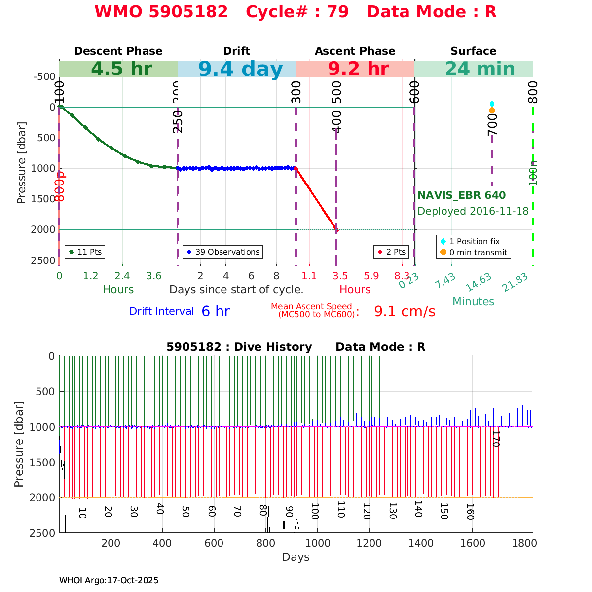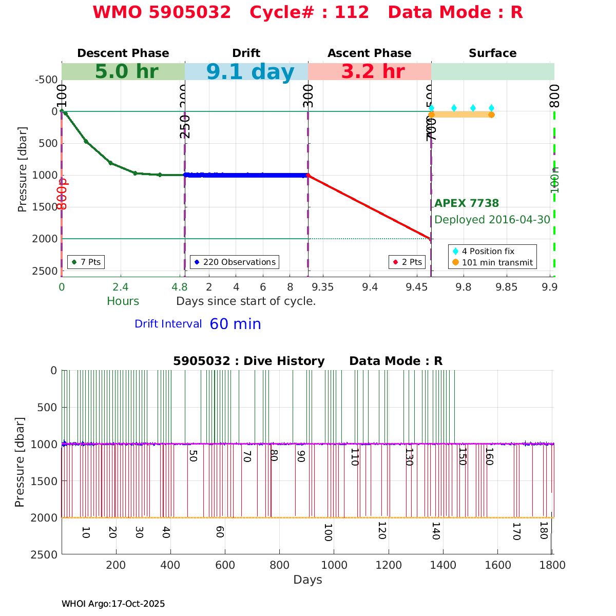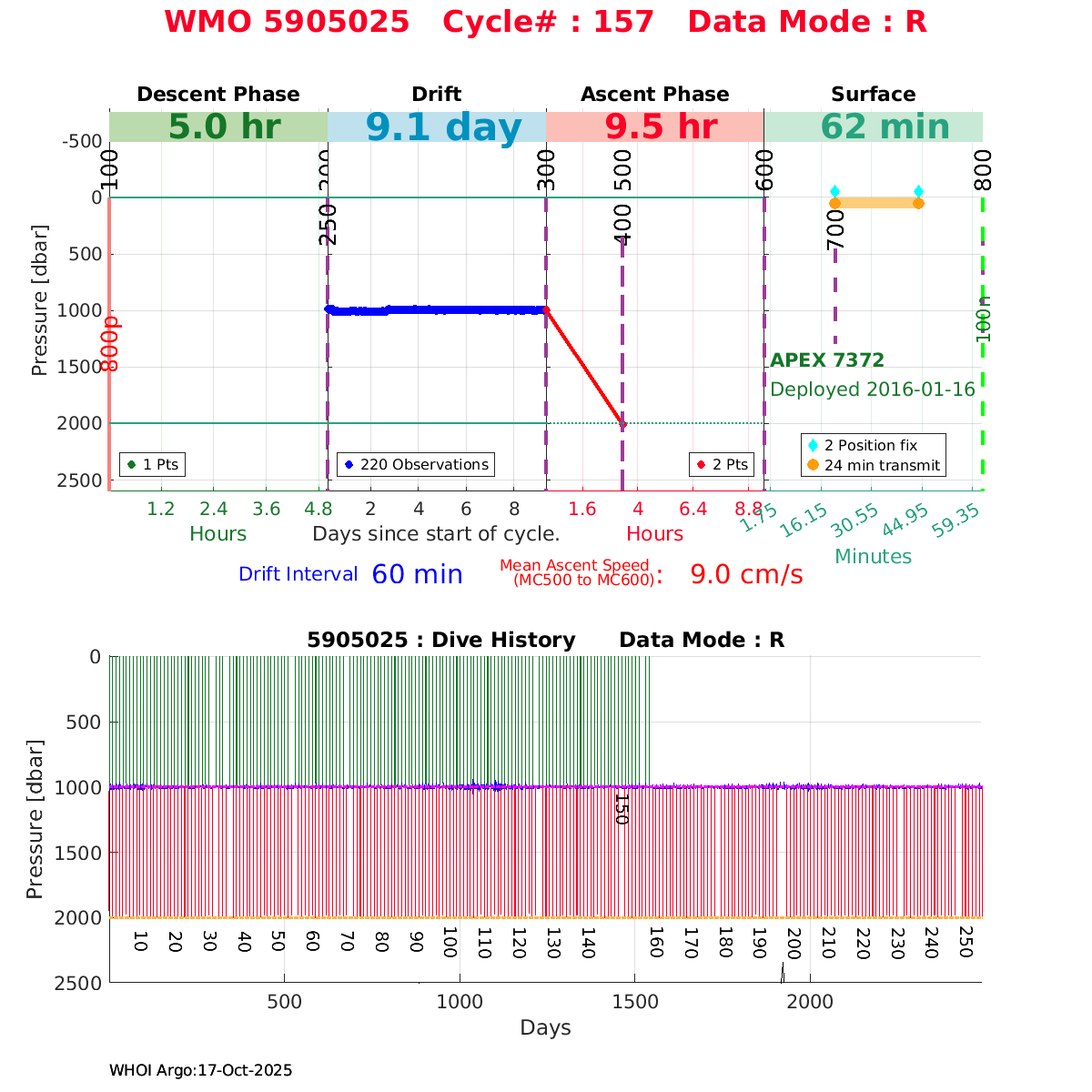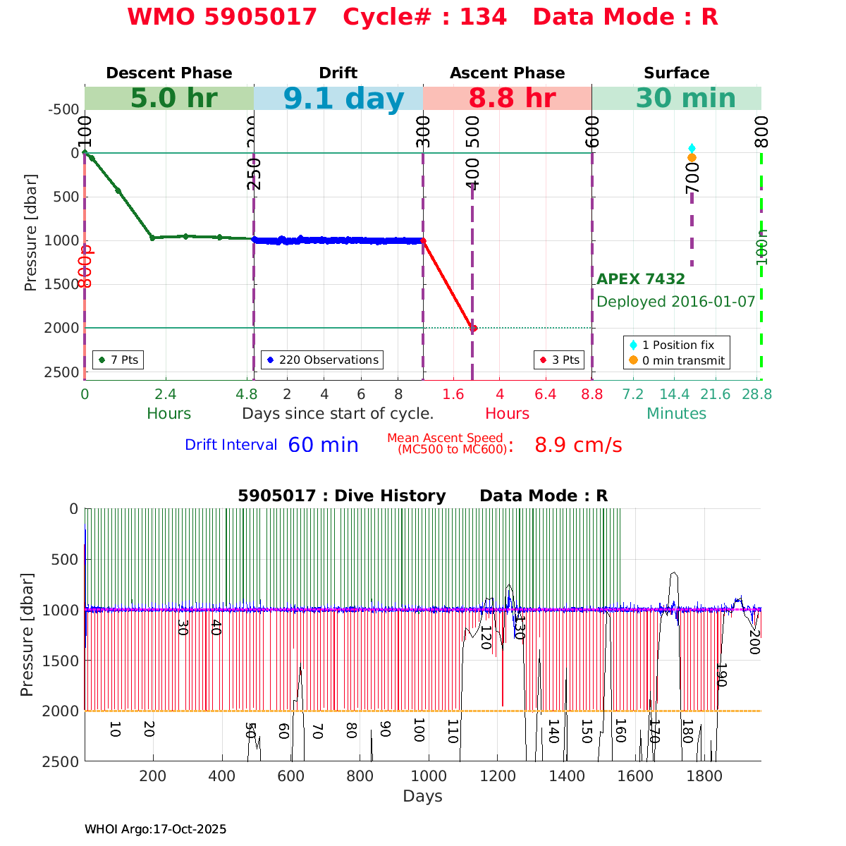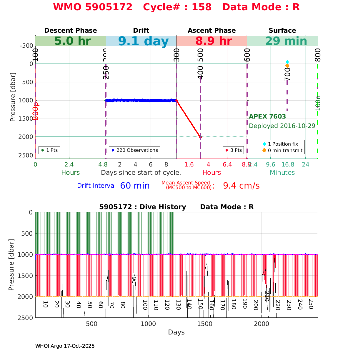 | WMO: #5905191 DAC: csiro PI: Susan Wijffels NAVIS_EBR: #763 SBE41CP_V7.2.5: #8633 DRUCK: #10300736 Altimeter Comparison (IFREMER) EuroArgo Link | ![]() |