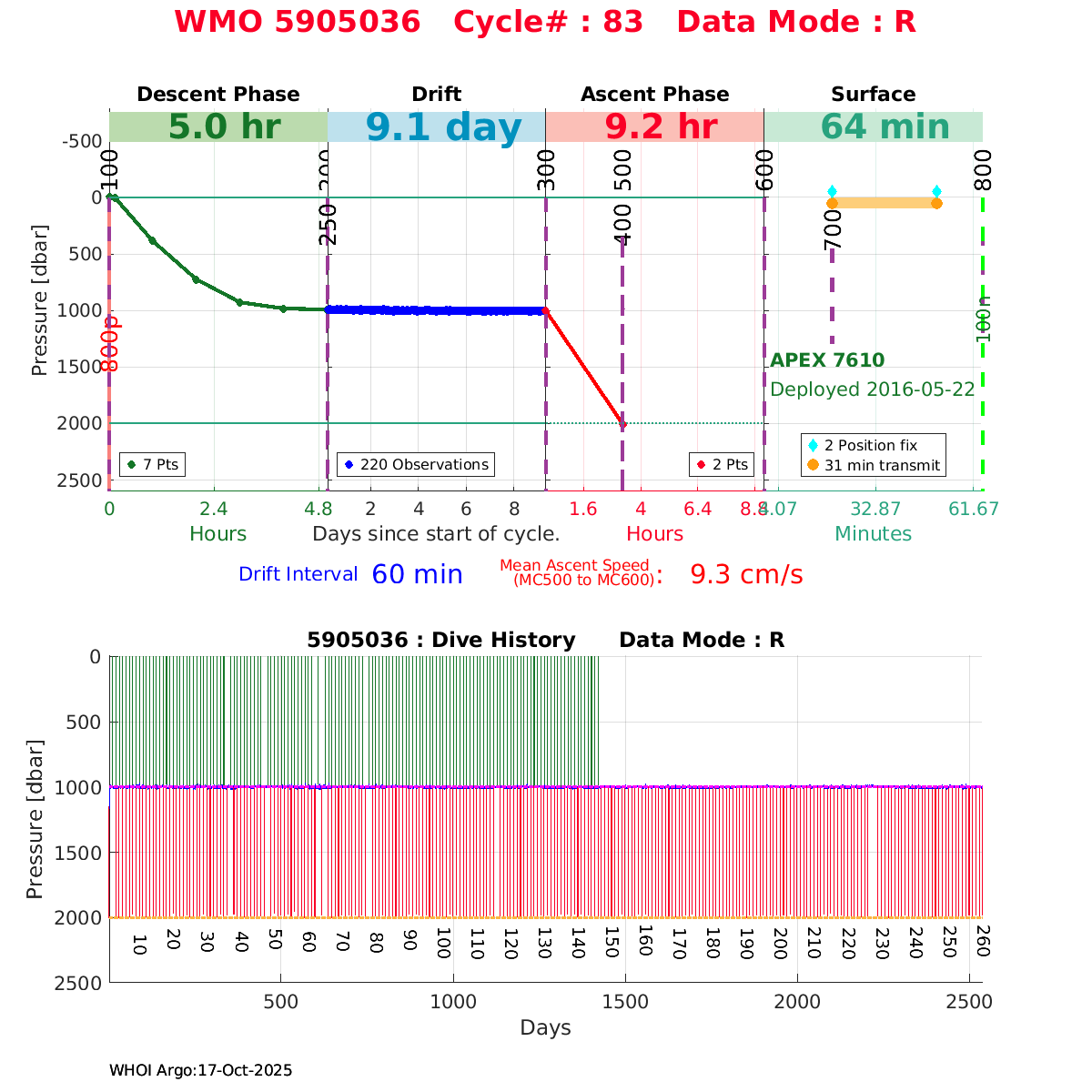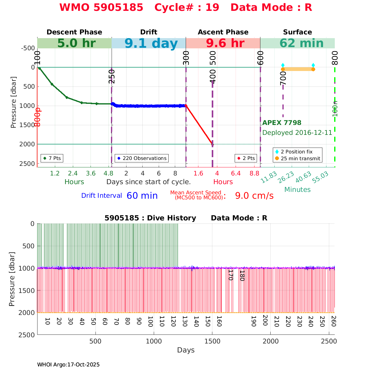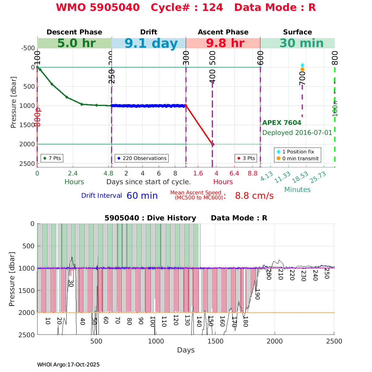 | WMO: #5905185 DAC: csiro PI: Susan Wijffels APEX: #7798 SBE41CP_V7.2.5: #8225 KISTLER: #4780000 Altimeter Comparison (IFREMER) EuroArgo Link | ![]() |