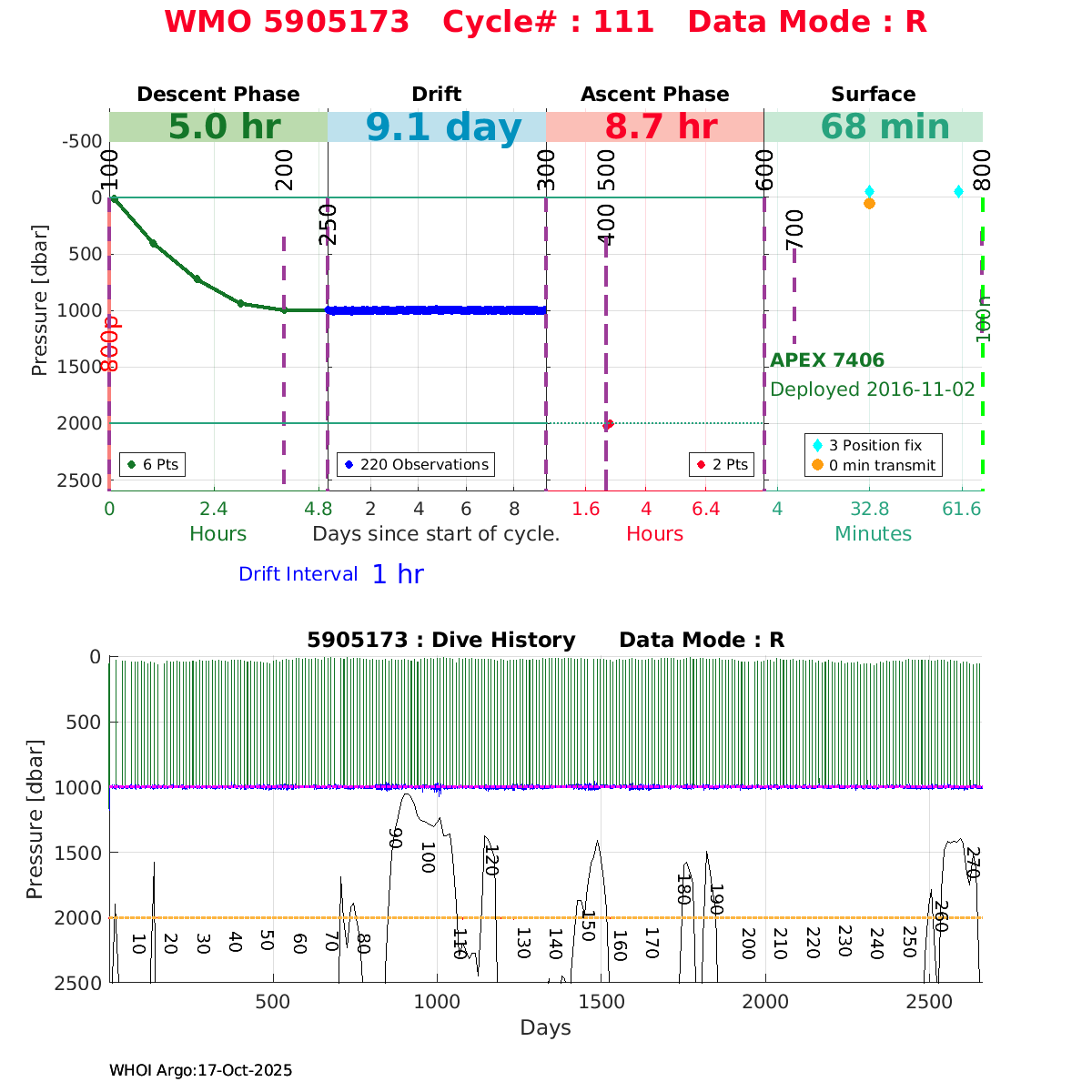 | WMO: #5905173 DAC: csiro PI: Susan Wijffels APEX: #7406 DRUCK: #4219030 SBE41CP_V2: #7006 Altimeter Comparison (IFREMER) EuroArgo Link | ![]() |