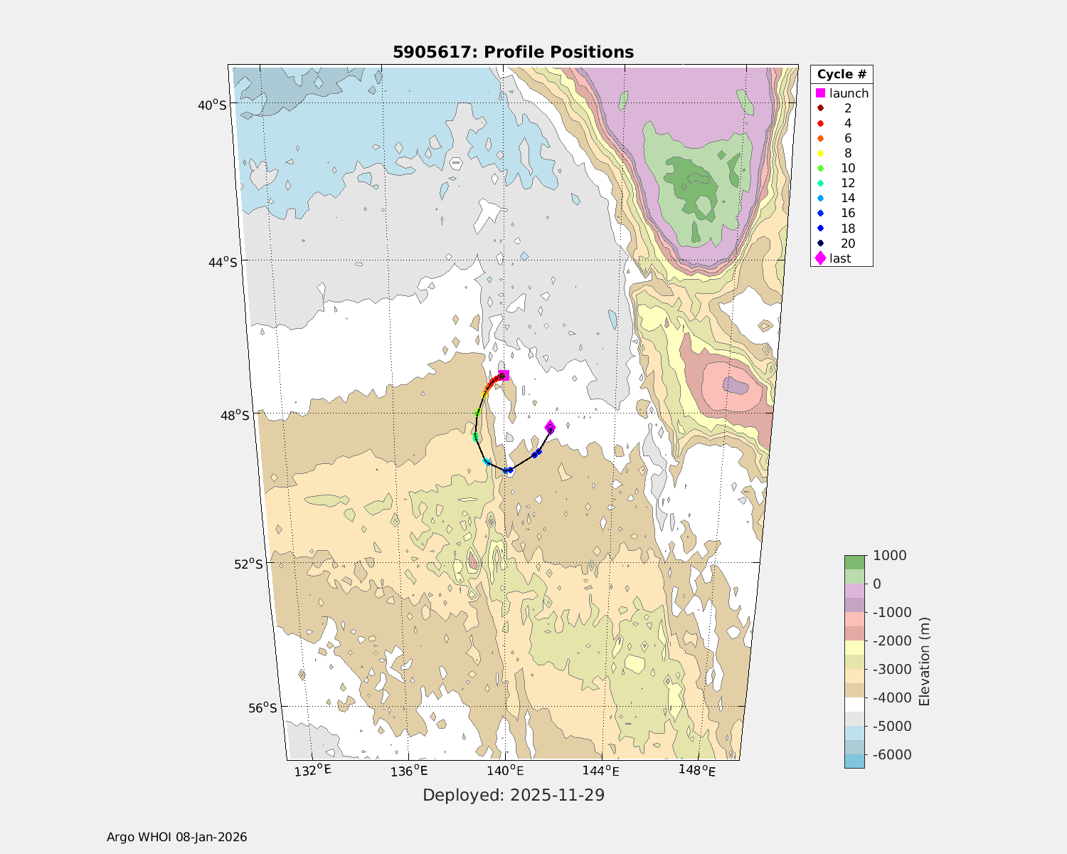 | WMO: #5905617 DAC: csiro PI: Philip BOYD PROVOR_V: # SBE41CP: #12429 AANDERAA_OPTODE_4330: #3334 SUNA_V2: #1376 SEAFET: #10356 SATLANTIC_OCR504_ICSW: #2057 ECO_FLBBCD: #6091 Altimeter Comparison (IFREMER) EuroArgo Link | n/a | n/a | ![]() |
