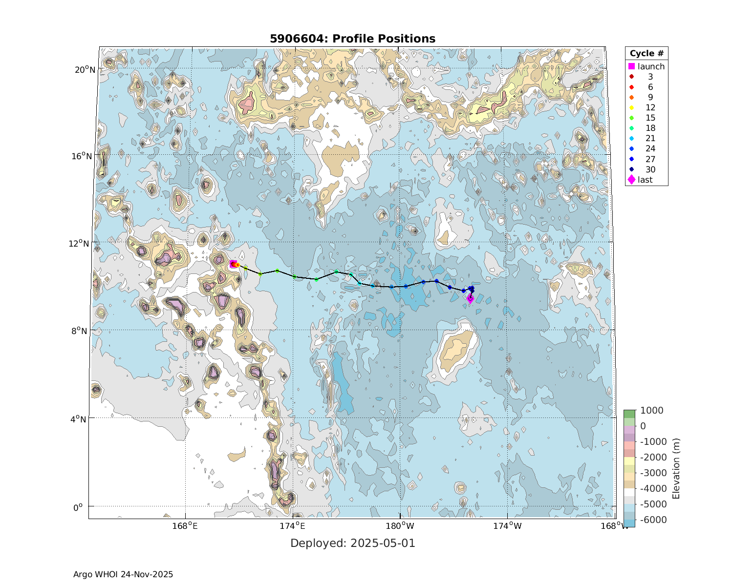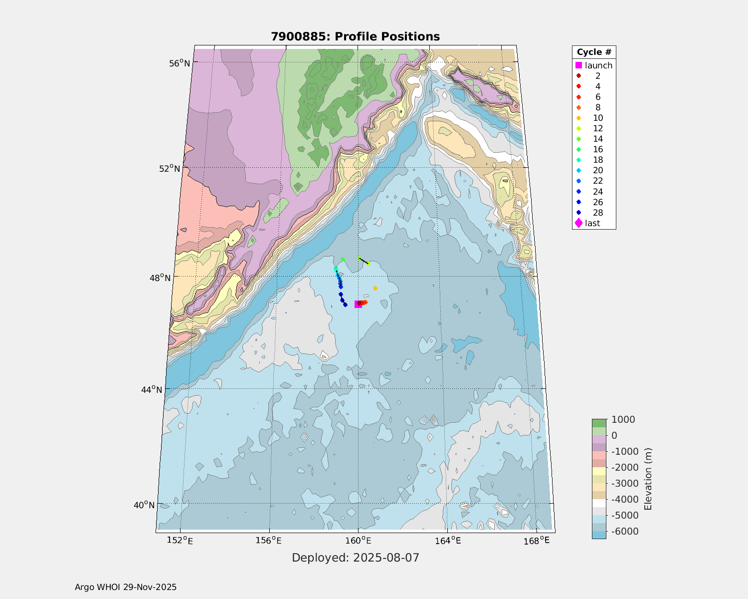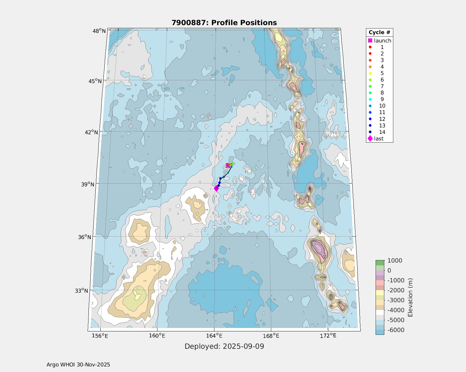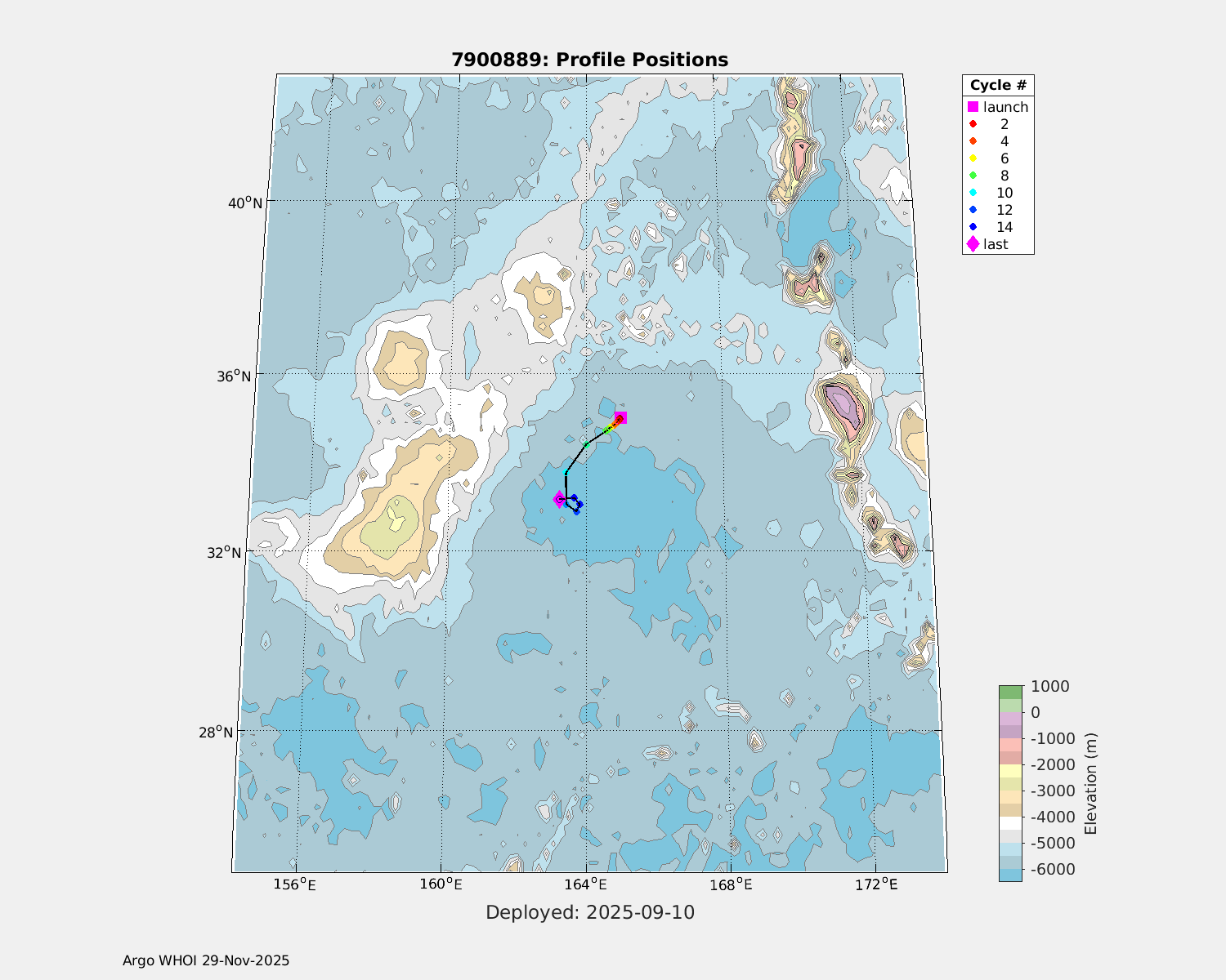 | WMO: #7900885 DAC: jma PI: Tetsuichi FUJIKI NAVIS_A: #1174 SBE41N: #12274 SBE63_OPTODE: #2379 MCOMS_FLBBCD: #297 SUNA_V2: #1395 Altimeter Comparison (IFREMER) EuroArgo Link | n/a | n/a | ![]() |