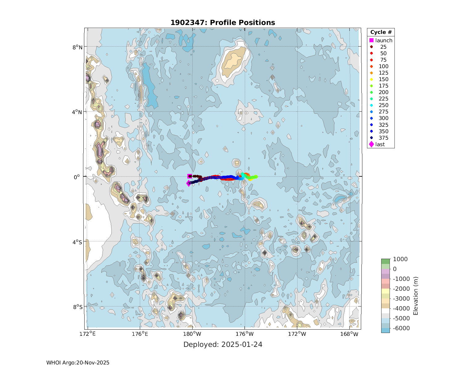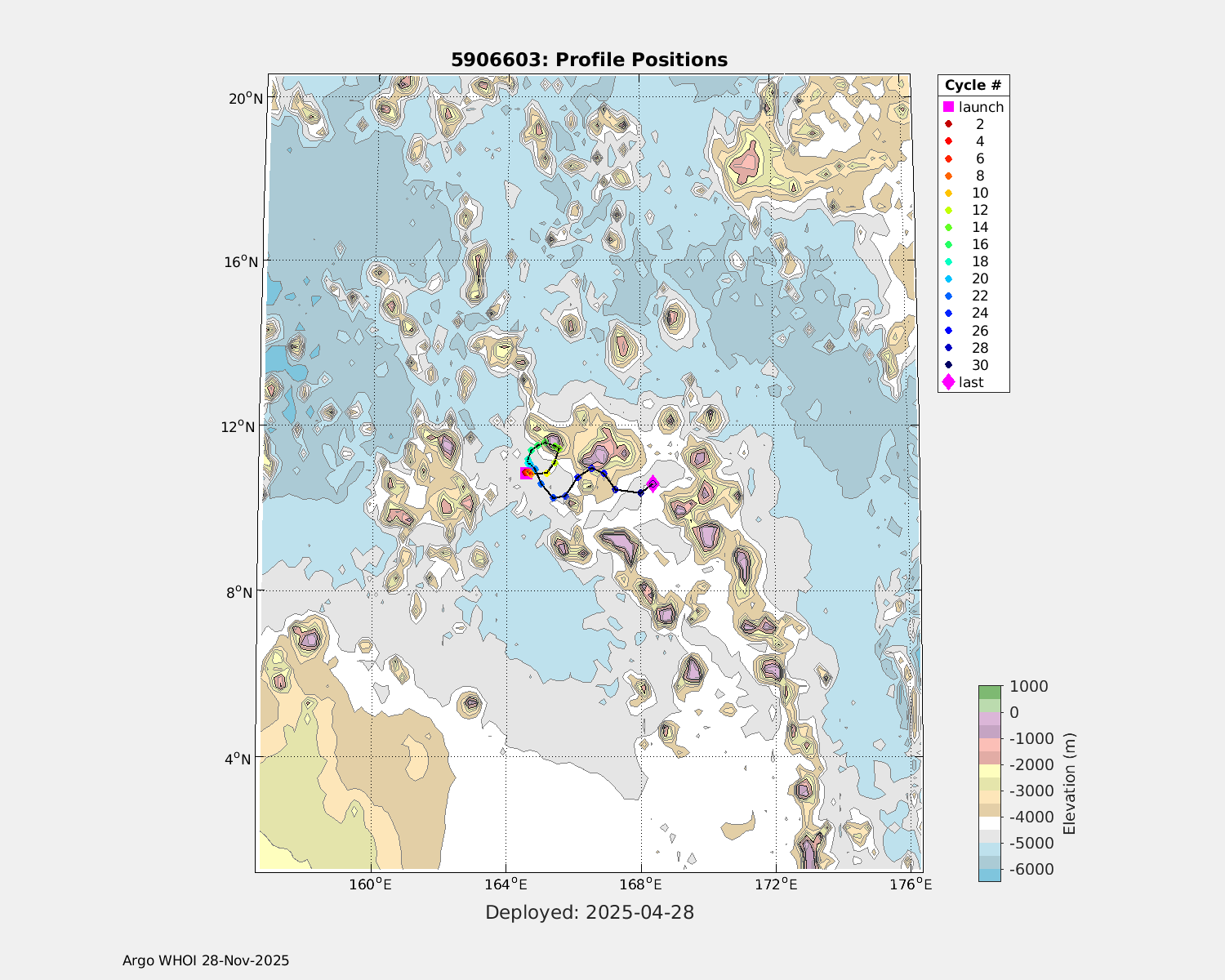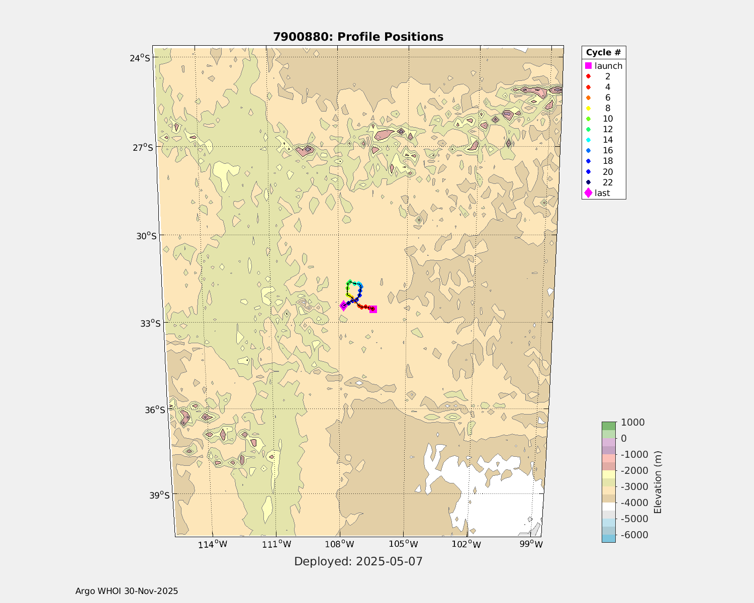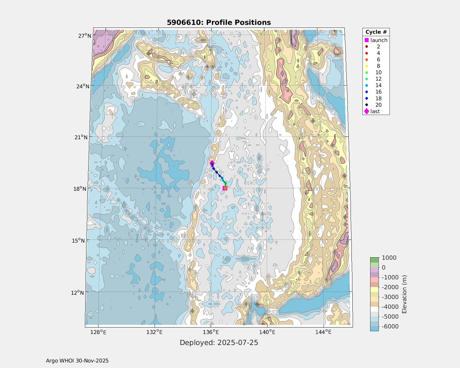 | WMO: #7900885 DAC: jma PI: Tetsuichi FUJIKI NAVIS_A: #1174 SBE41N: #12274 SBE63_OPTODE: #2379 MCOMS_FLBBCD: #297 SUNA_V2: #1395 Altimeter Comparison (IFREMER) EuroArgo Link | n/a | n/a | ![]() |