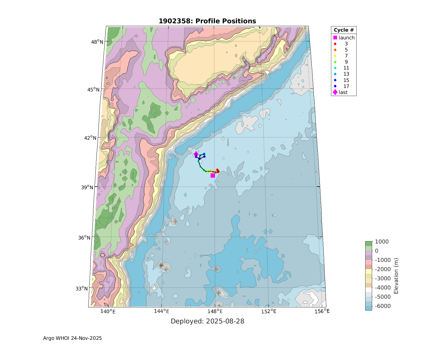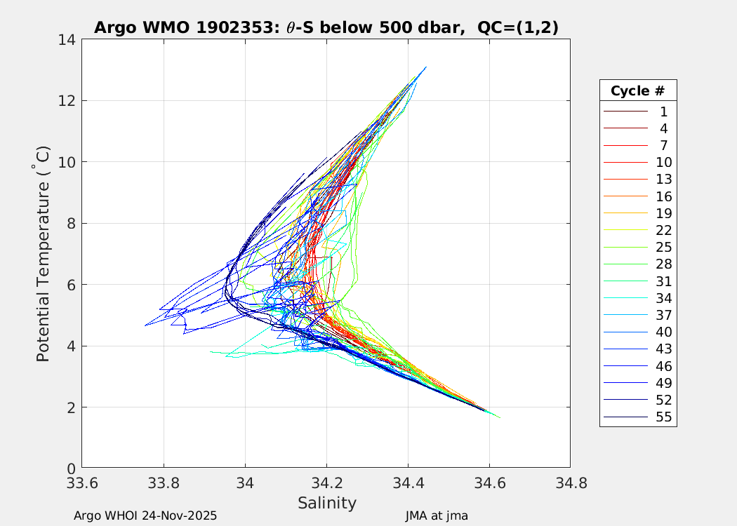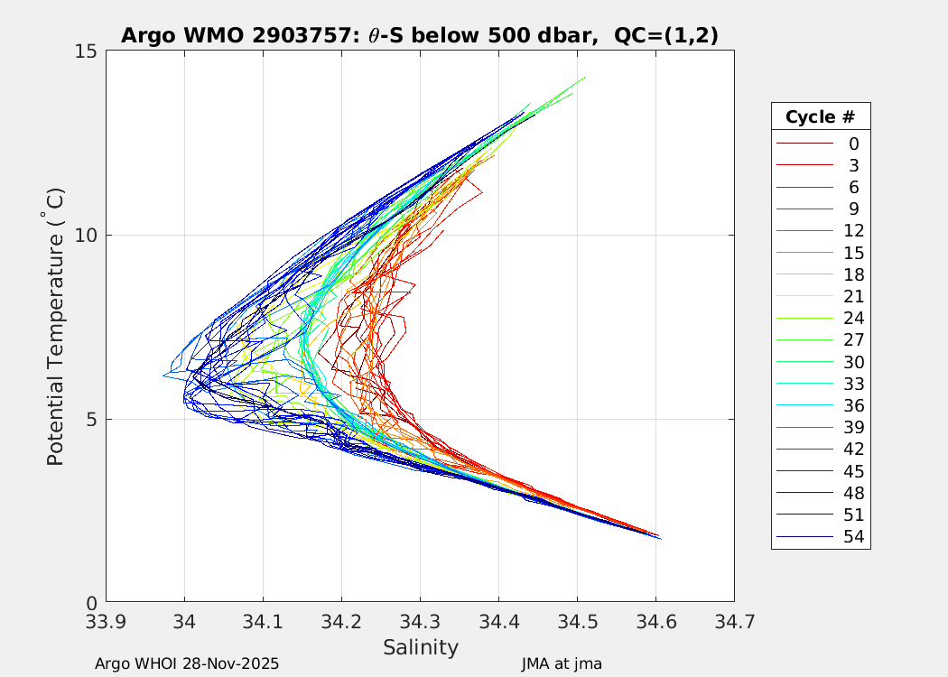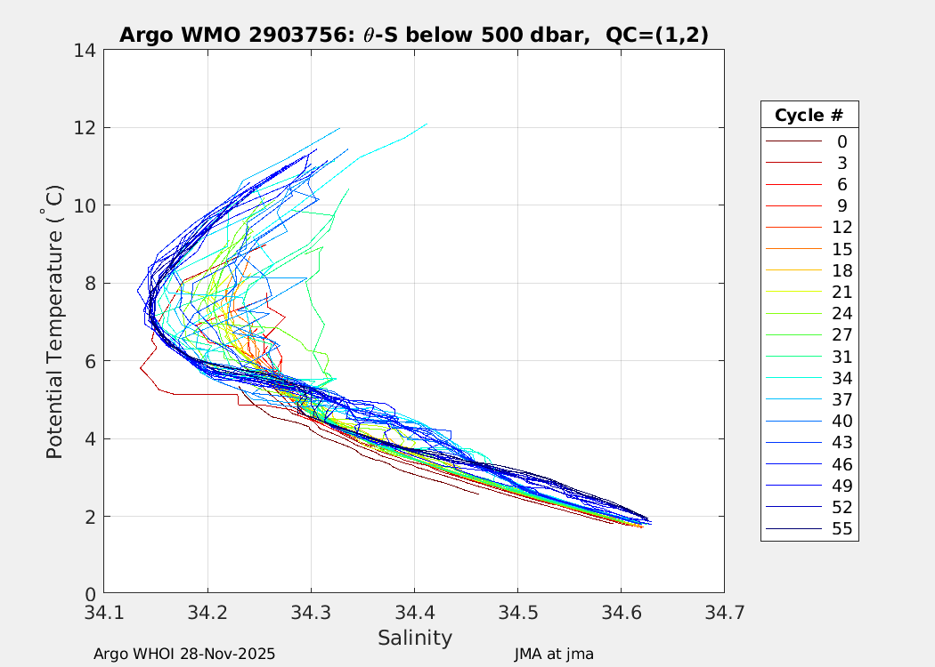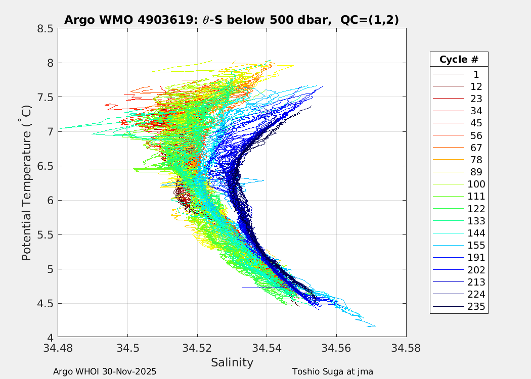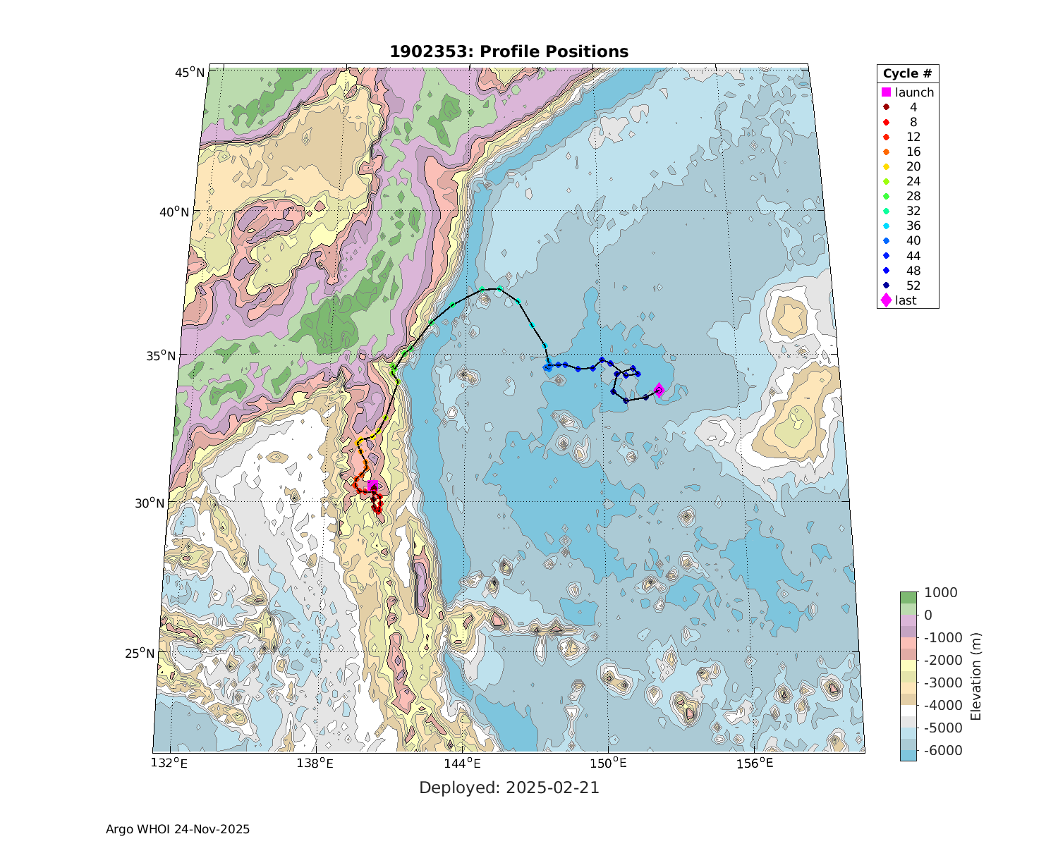 | WMO: #4903613 DAC: jma PI: JAMSTEC NAVIS_A: #1654 SBE41N_V5.3.5: #19402 SBE63_OPTODE: #3732 MCOMS_FLBBCD: #485 SUNA_V2: #2256 Altimeter Comparison (IFREMER) EuroArgo Link | ![]() |