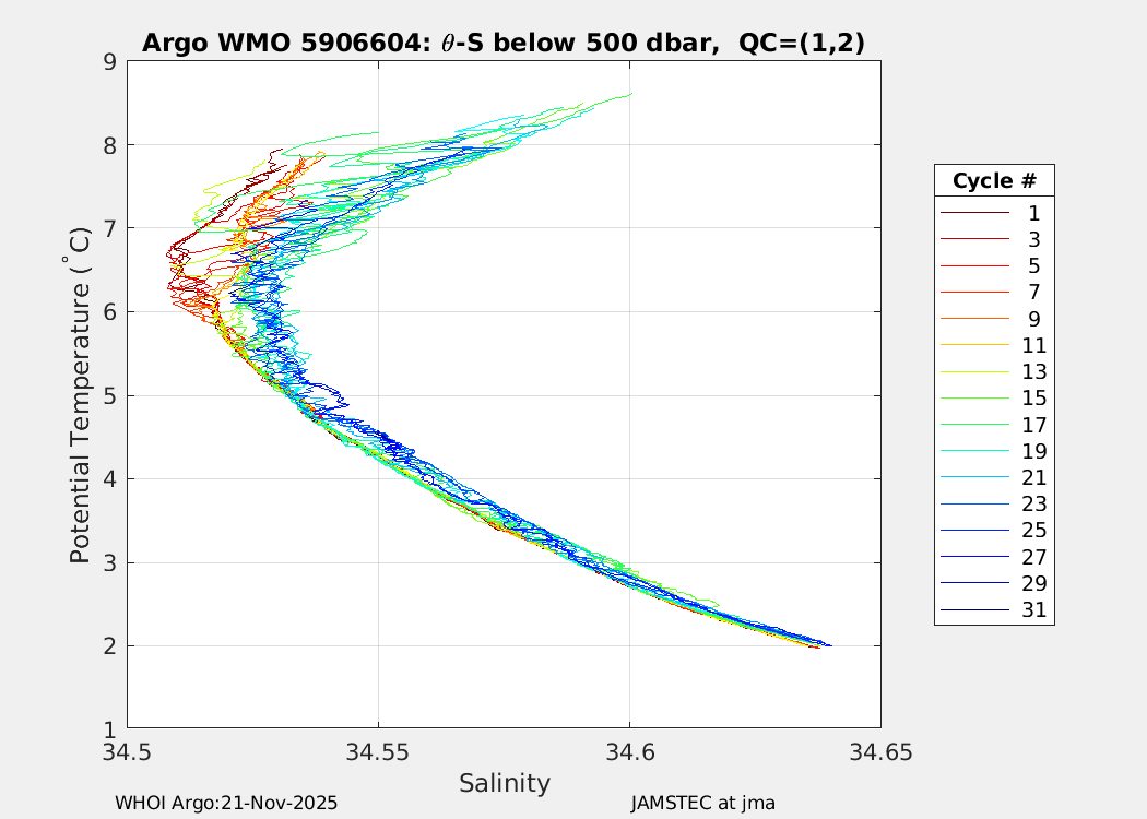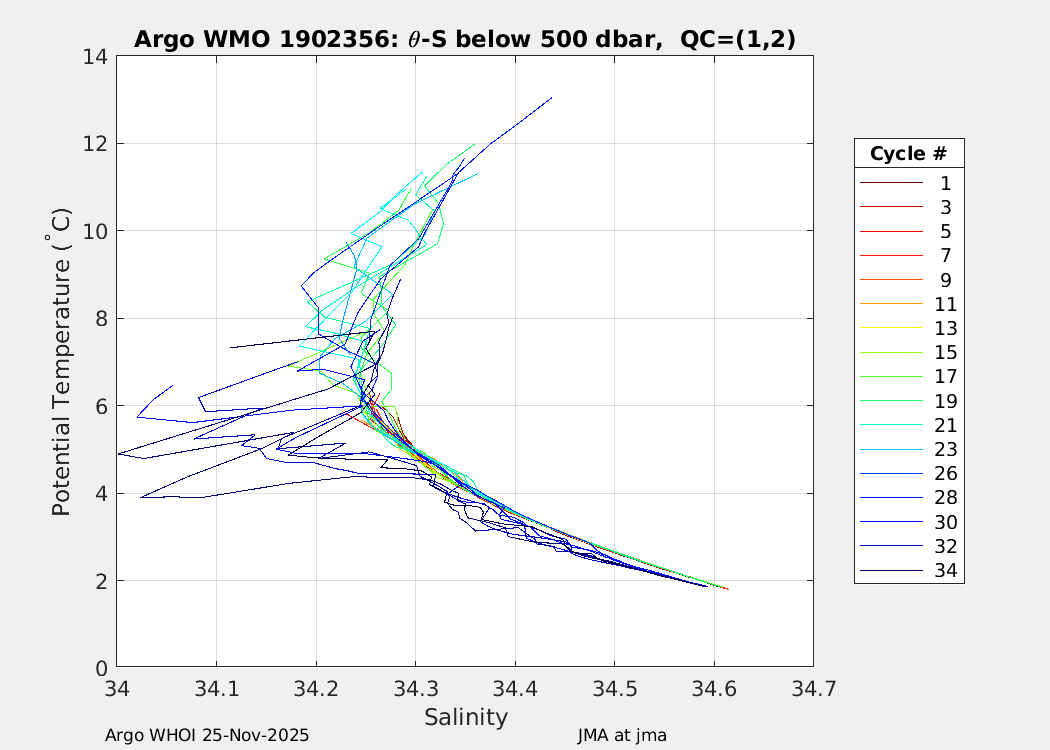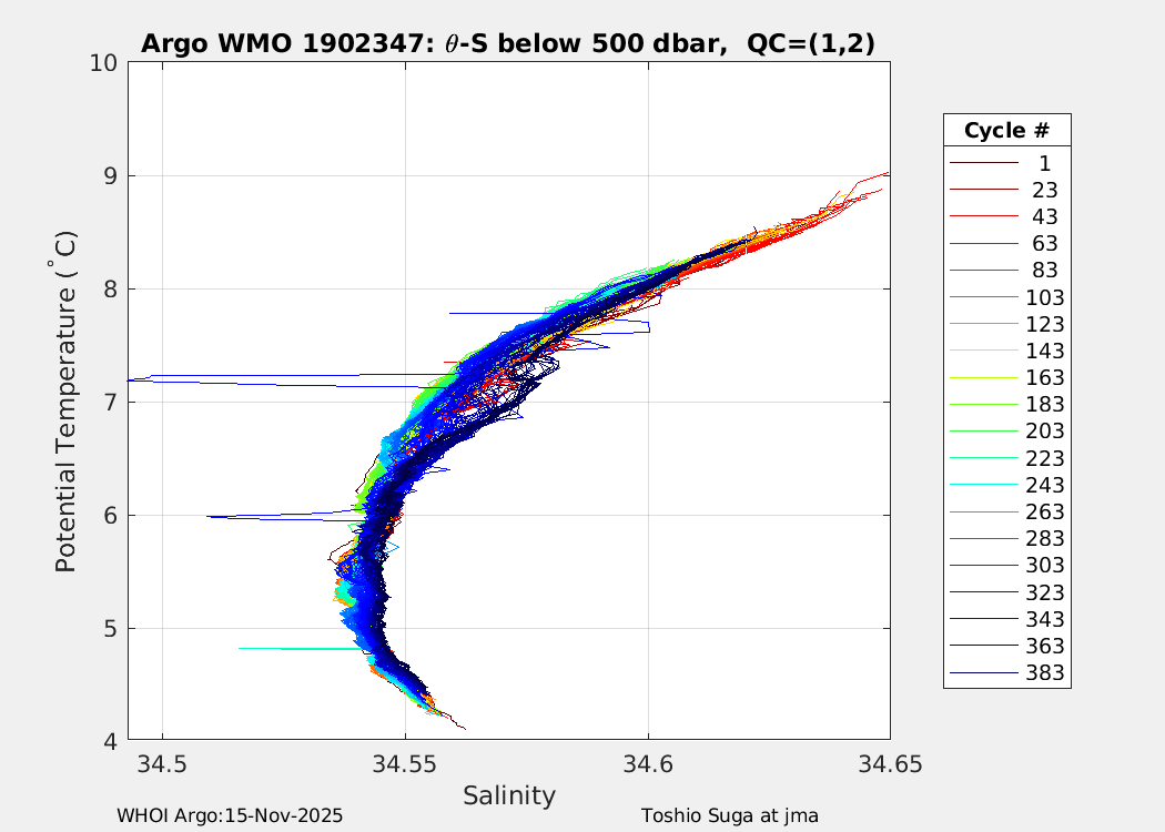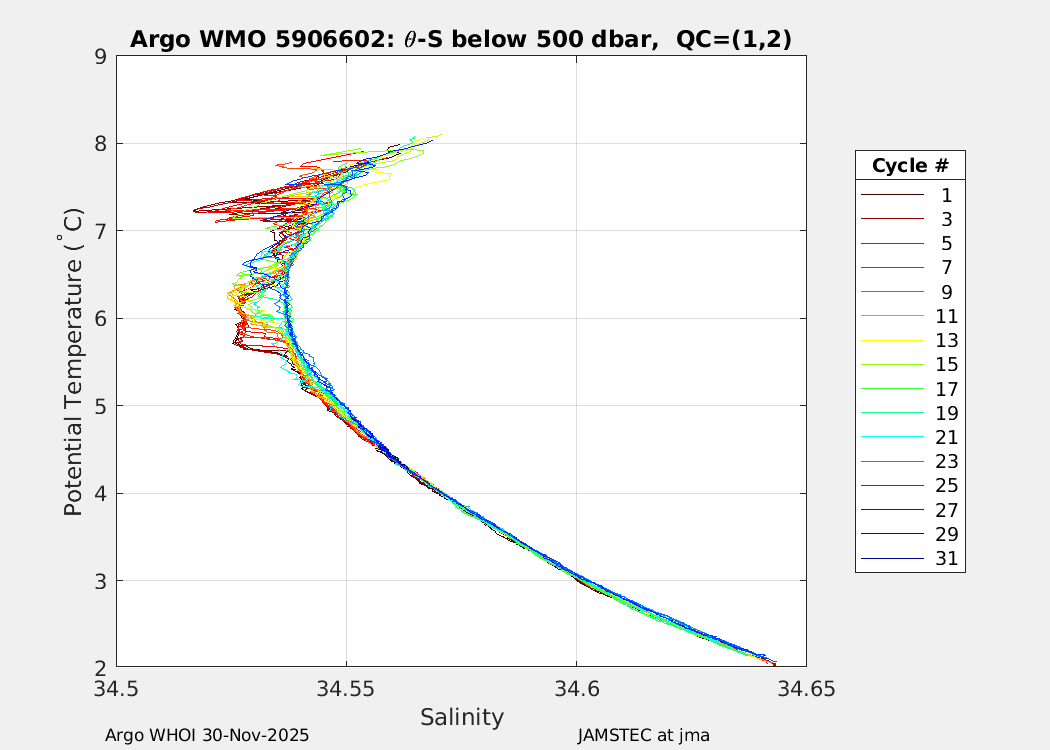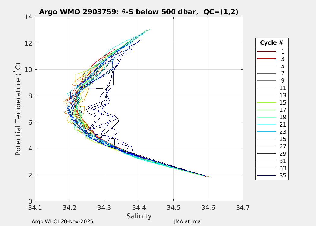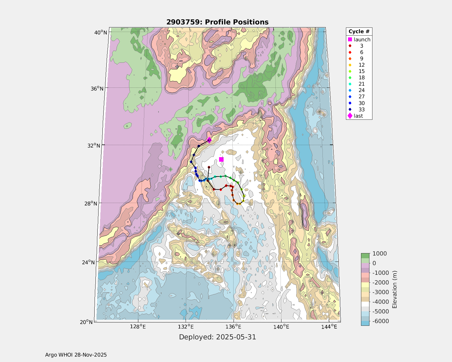 | WMO: #4903613 DAC: jma PI: JAMSTEC NAVIS_A: #1654 SBE41N_V5.3.5: #19402 SBE63_OPTODE: #3732 MCOMS_FLBBCD: #485 SUNA_V2: #2256 Altimeter Comparison (IFREMER) EuroArgo Link | ![]() |