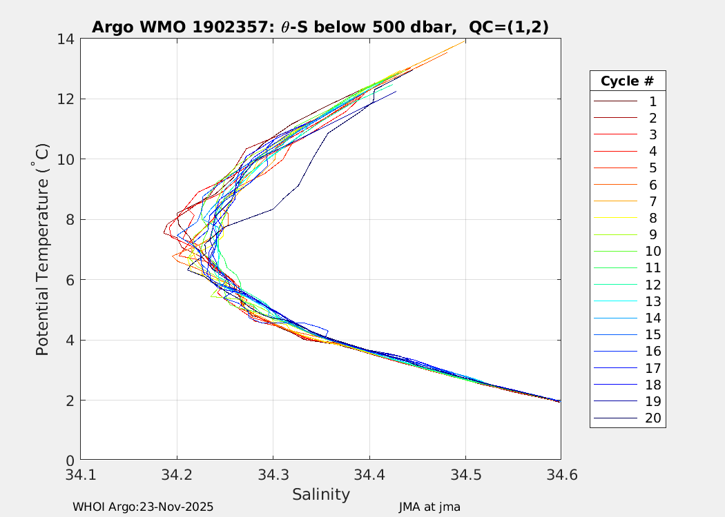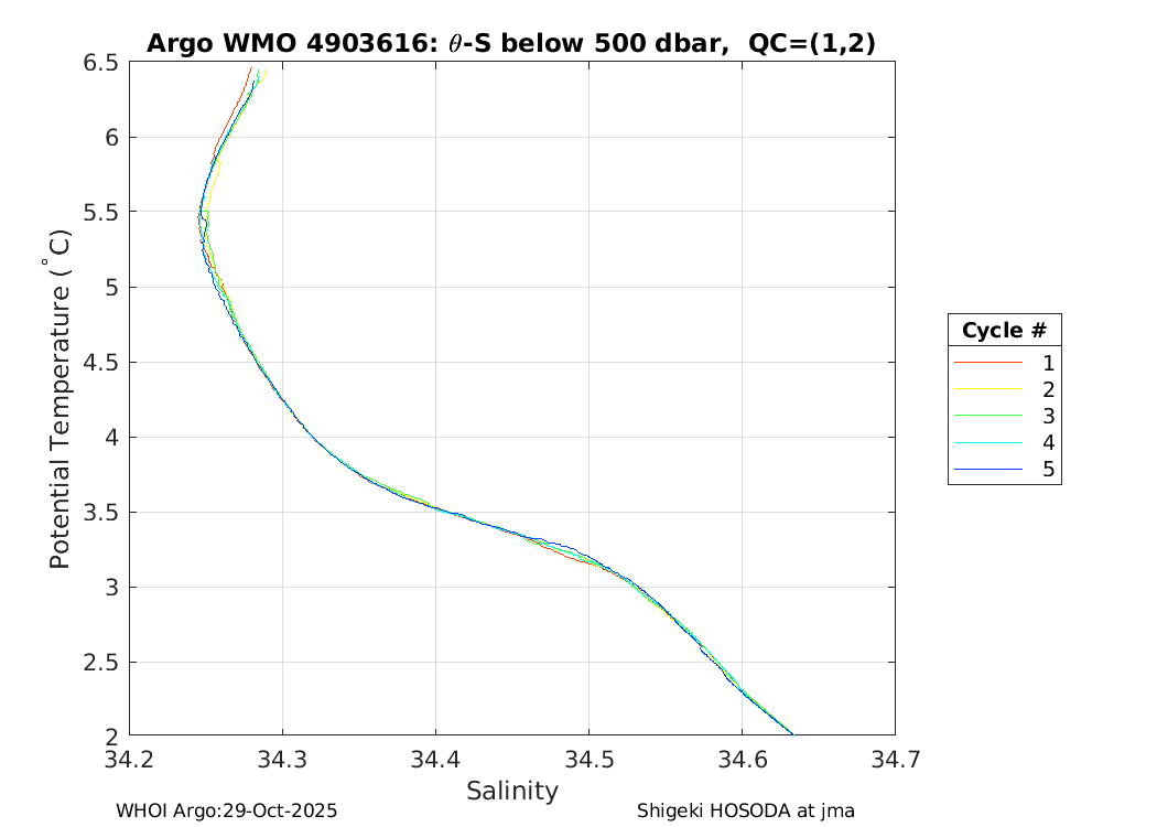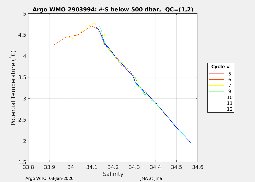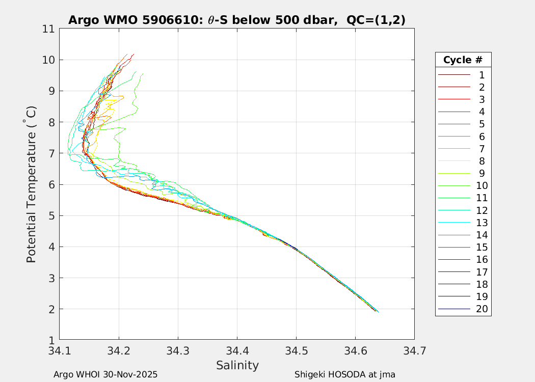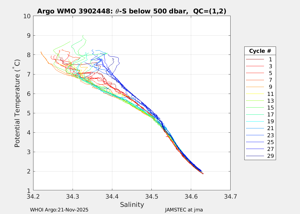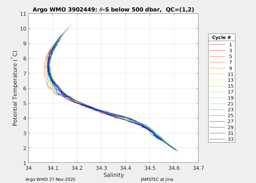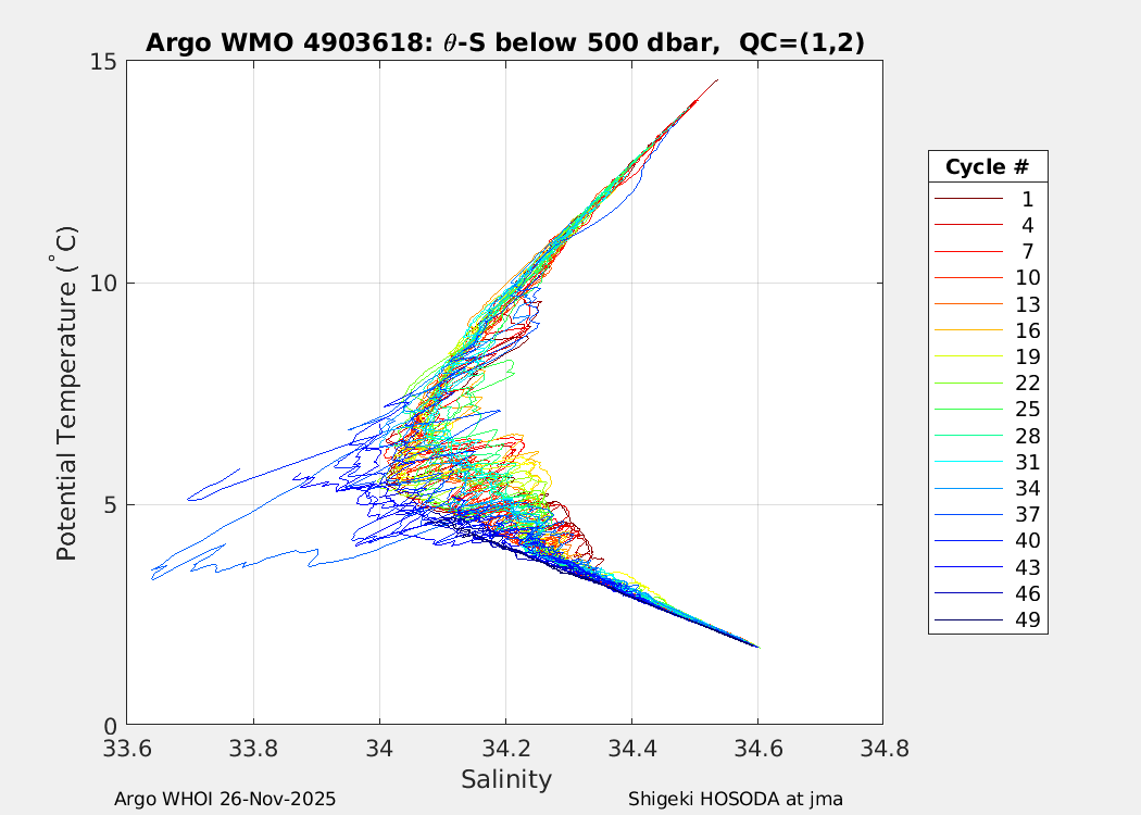 | WMO: #4903613 DAC: jma PI: JAMSTEC NAVIS_A: #1654 SBE41N_V5.3.5: #19402 SBE63_OPTODE: #3732 MCOMS_FLBBCD: #485 SUNA_V2: #2256 Altimeter Comparison (IFREMER) EuroArgo Link | ![]() |