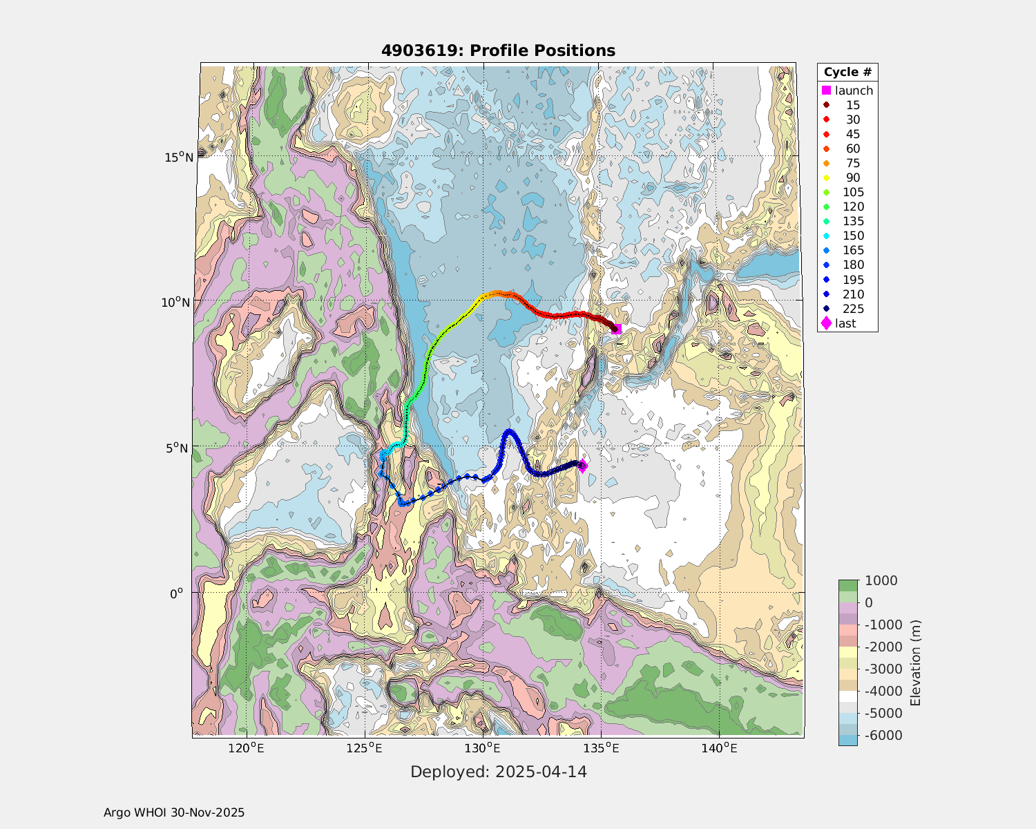| WMO: #4903619 DAC: jma PI: Toshio Suga APEX: #10765 SBE41CP_V7.2.5: #20613 ECO_FLBBCD_AP2: #9092 SATLANTIC_OCR504_ICSW: #2556 Altimeter Comparison (IFREMER) EuroArgo Link | n/a | n/a | ![]() |