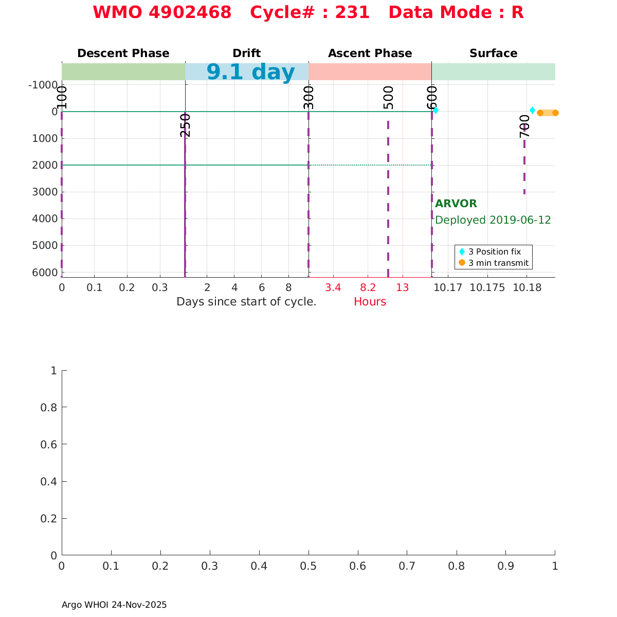 | WMO: #4902468 DAC: meds PI: Blair Greenan ARVOR: # SBE41CP: #41CP-11250 Altimeter Comparison (IFREMER) EuroArgo Link | ![]() |