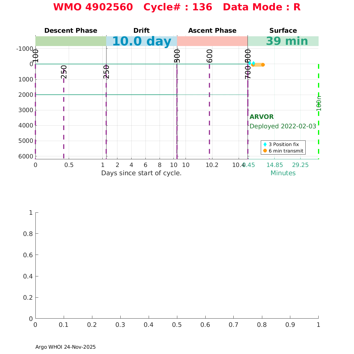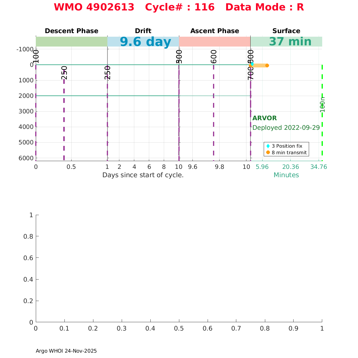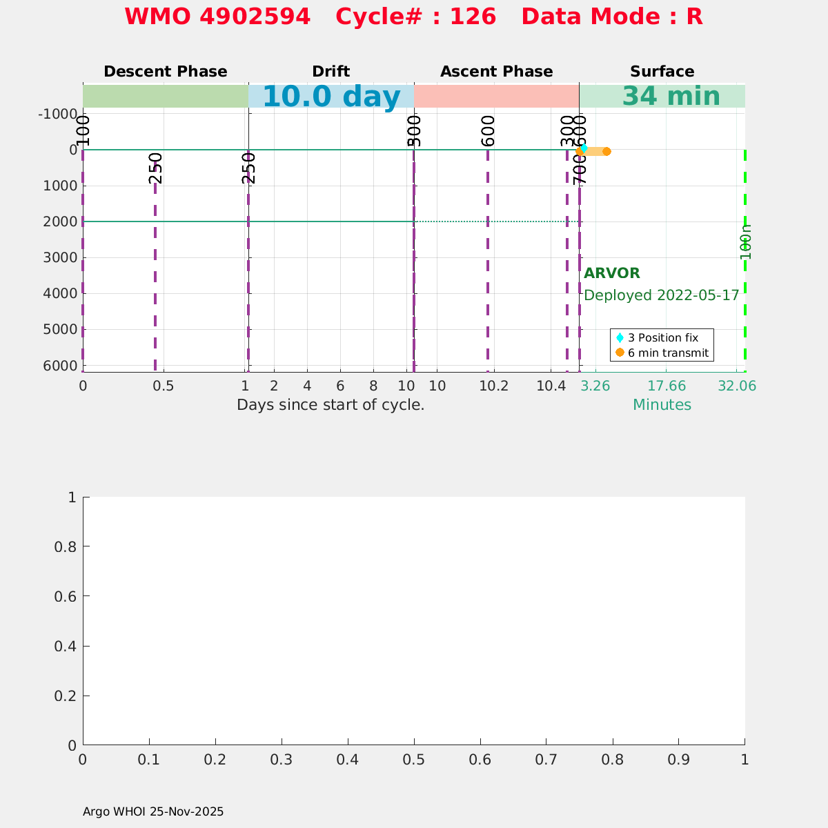 | WMO: #4902594 DAC: meds PI: Marc Ringuette ARVOR: # SBE41CP: #n/a SBE41CP: #41CP-13212 FLOATCLOCK: # Altimeter Comparison (IFREMER) EuroArgo Link | ![]() |