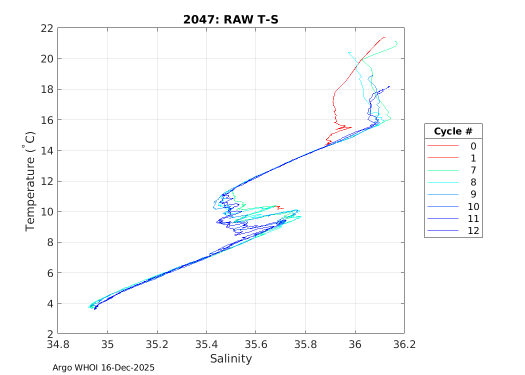 | Etc Telemetry: 2052 GDAC plots: 2904054 SOLO2IR_TS9 SBE41CP: #21076 Druck: #12742457 Deployed: 2025-12-13 MV Bulk Xaymaca, MV Bulk Xaymaca-2025 | ![]() |